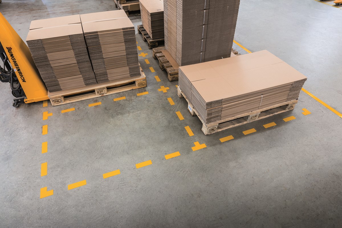 Självhäftande golvmärkningssymbol för markering eller avgränsning inomhus. Fäster på rena och torra betonggolv. Slitstarka och tåliga med halkskyddsgrad R9 i enlighet med DIN 51130. 10 st/förp.