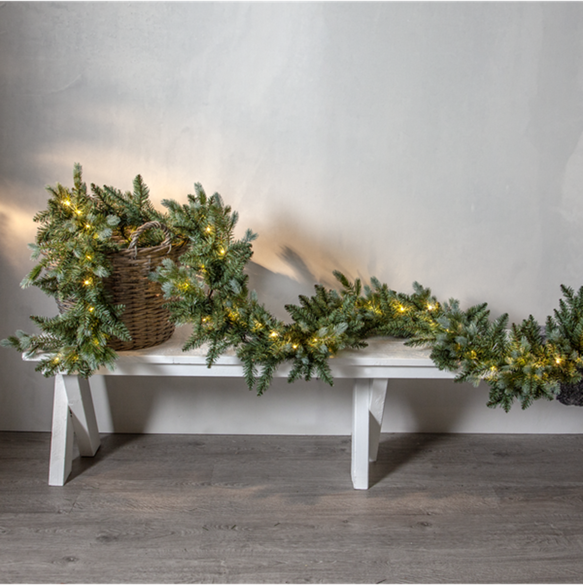 Girlangen Greyland är ca 300 cm i lång och 20 cm bred. Den är tillverkade av en mix av PE-tips och PVC-tips med ett vackert grå-grönt skimrande utseende. Med 60 små varmvita ljuspunkter lyser den upp vackert både inomhus och utomhus. Slingan kan både lysa konstant eller sättas med timer som lyser upp i 6 timmar och är släckt 18 timmar för att sedan tändas igen nästa dag. Drivs av 3 st AA-batterier (medföljer ej).