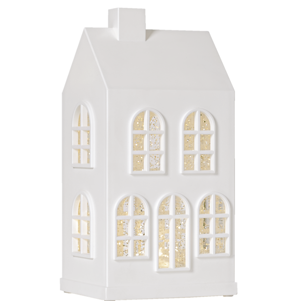 Fantastiskt vitt huslykta som juldekoration. Det snöar och lyser vackert när produkten är påslagen. Batteridriven med timerfunktion. Placera på ett bord eller en hylla för en härlig advents- och julstämning. Drivs med 3 st AA-batterier (medföljer ej).