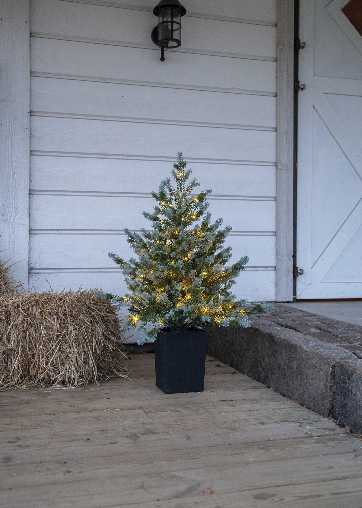 Granen Greyland är ca 90 cm hög och 70 cm bred. Den är tillverkade av en mix av PE-tips och PVC-tips med ett vackert grågrönt utseende. Med 80 små varmvita ljuspunkter lyser den upp vackert på en trapp eller inomhus där man önskar en mindre gran. Slingan kan både lysa konstant eller sättas med timer som lyser upp i 6 timmar och är släckt 18 timmar för att sedan tändas igen nästa dag. Den drivs av 3 st AA-batterier (medföljer ej). Den svarta krukan medföljer och är ca 17x23 cm.