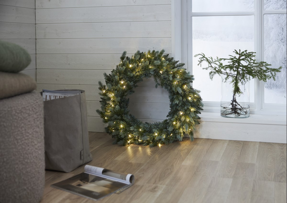 Kransen Greyland är ca 80 cm i diameter. Vackert grågrönt skimrande utseende. Med 60 små varmvita ljuspunkter lyser den upp vackert både inomhus och utomhus. Slingan kan både lysa konstant eller sättas med timer som lyser upp i 6 timmar och är släckt 18 timmar för att sedan tändas igen nästa dag. Den drivs av 3 st AA-batterier (medföljer ej).