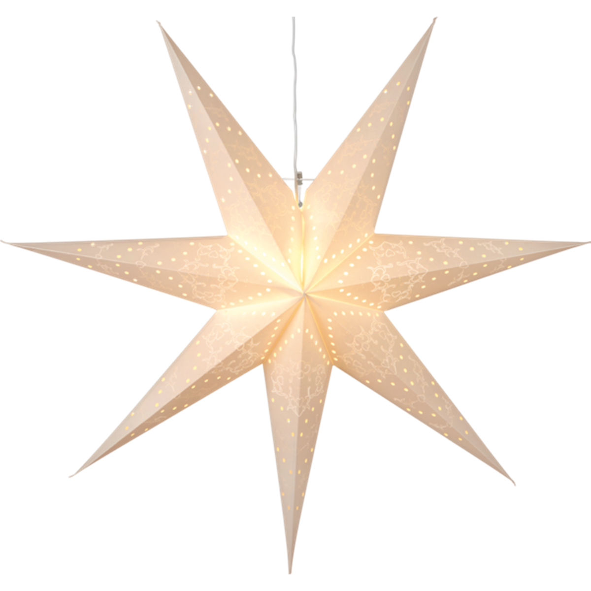 Mönstrad pappersstjärna i vit design. Fin stjärna att dekorera med i fönstret. Inkl. 3,5 m kabel, exkl. ljuskälla (E14). Mått: 70 x 70 cm.