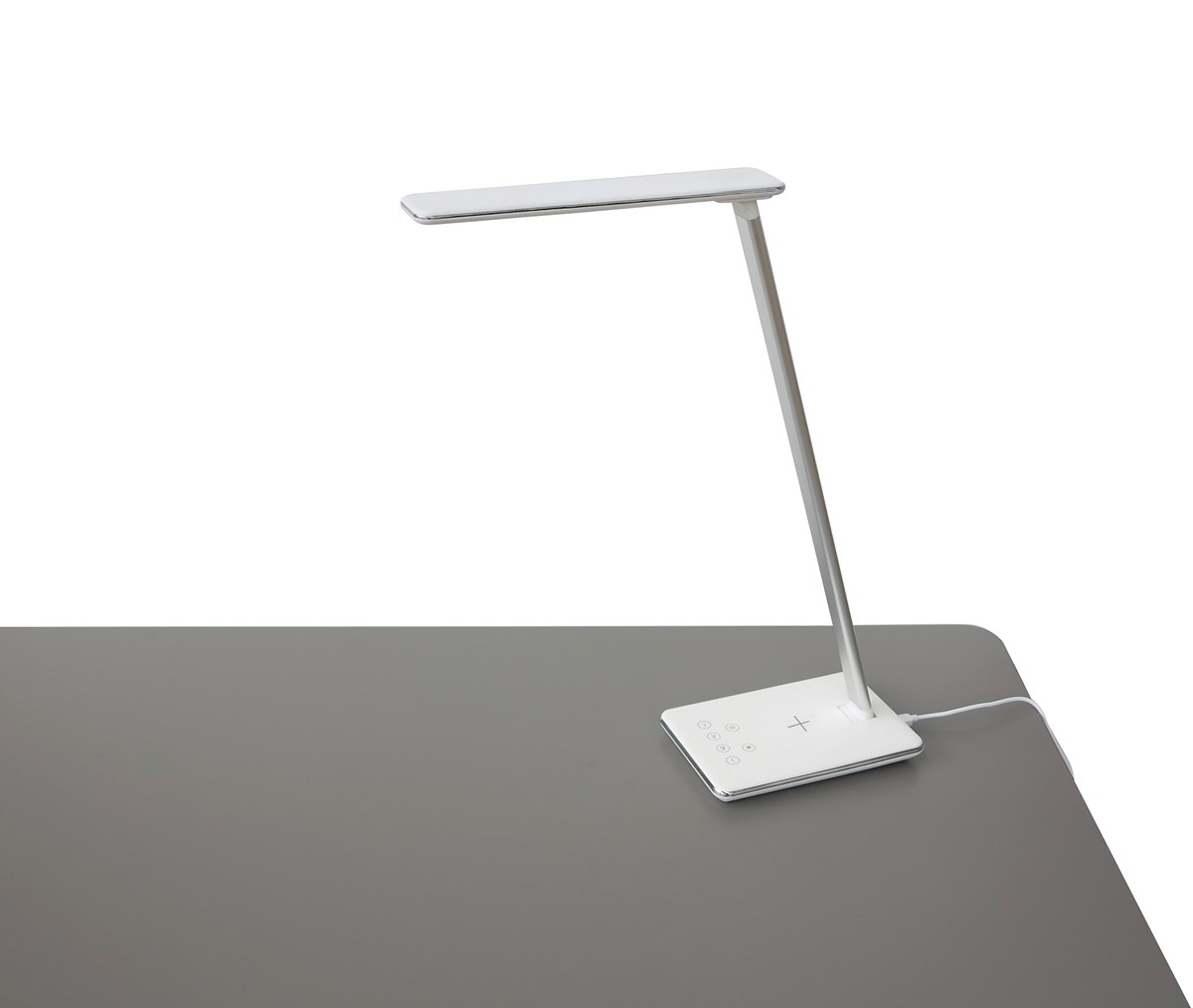 Stilren, nätt skrivbordslampa med smarta tekniska funktioner. Inbyggd Qi-laddare i foten och USB-uttag för laddning. Lampan blir liten och platt i hopfällt skick för att lägg kunna förflyttas och för enkel förvaring. Detta för att underlätta vid t.ex. aktivitetsbaserat kontor med "clean desk philosopy" och möjliggör individuell belysning för ökat välbefinnande och ökad koncentration. Färgtemperatur och ljusstyrka kan justeras efter ditt behov. 7 W LED. Timerfunktion. Mått: armländ 480 mm, bordsfot 180 x 120 mm, lamphuvud 250 x 50 mm.
