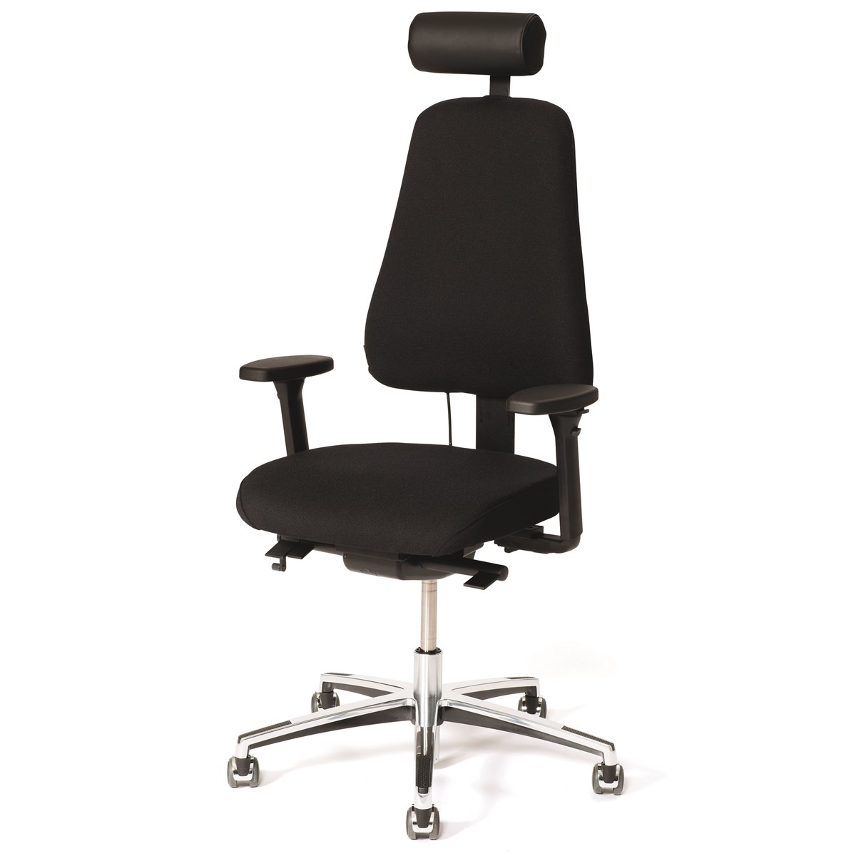 En kontorsstol med hög ergonomi, design och kvalitet. Stolen har en multisynkrongunga som gör att du alltid får rätt stöd och sittkomfort, hur du än väljer att sitta. Stolen följer nämligen din arbetsställning: lutar du dig framåt vinklas även sitsen framåt och lutar du dig bakåt öppnas höftvinkeln upp så att blodcirkulationen stimuleras och ryggen avlastas. Sitsen kan även justeras individuellt. Utrustad med kromkryss, kromgaspelare och kromade hjul. Svart tyg i 100% kamgarnsull. Armstöd, svankstöd och nackstöd är tillbehör.