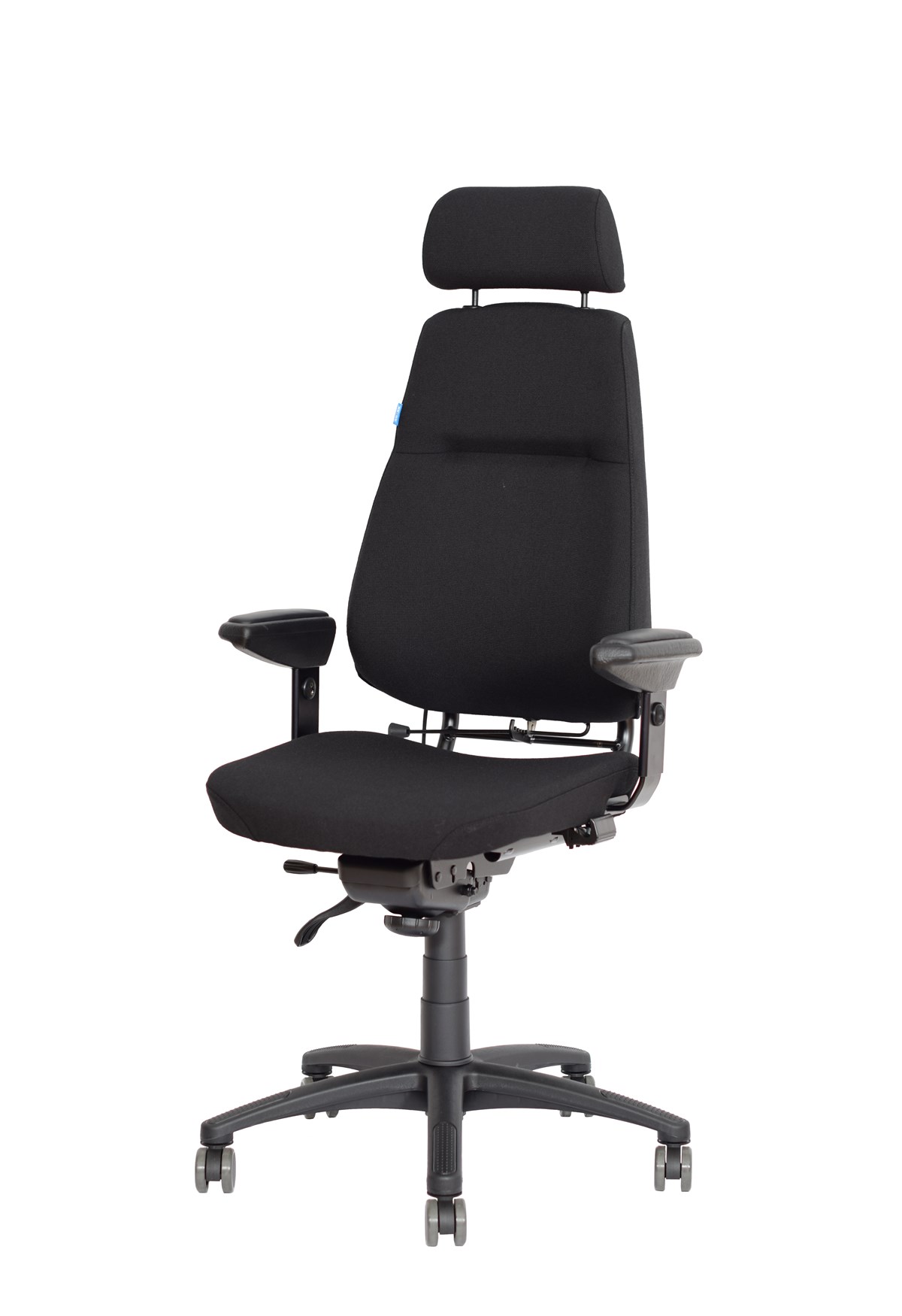 Sverigestolen, även kallad Klassikern är efter 40 år fortfarande är en efterfrågad modell. Stolen är utrustad med en behaglig och följsam knäledsgunga som är steglöst låsbar. XL-modellen har en högre rygg och längre sittdyna som passar bättre för längre personer. Individuellt inställbar sittdjupsjustering av sittdynan och vinkling av ryggen. Levereras med läderklädda armstödskuddar som är justerbara i höjd- och sidled. Nackstödet är justerbart i höjdled samt vinklingsbart. Utrustad med hjul för hårda golv. Levereras klädd i ett slitstarkt, svart ulltyg (Gaja) som standard. 5 års garanti. Frakt tillkommer, kontakta oss för prisuppgift.