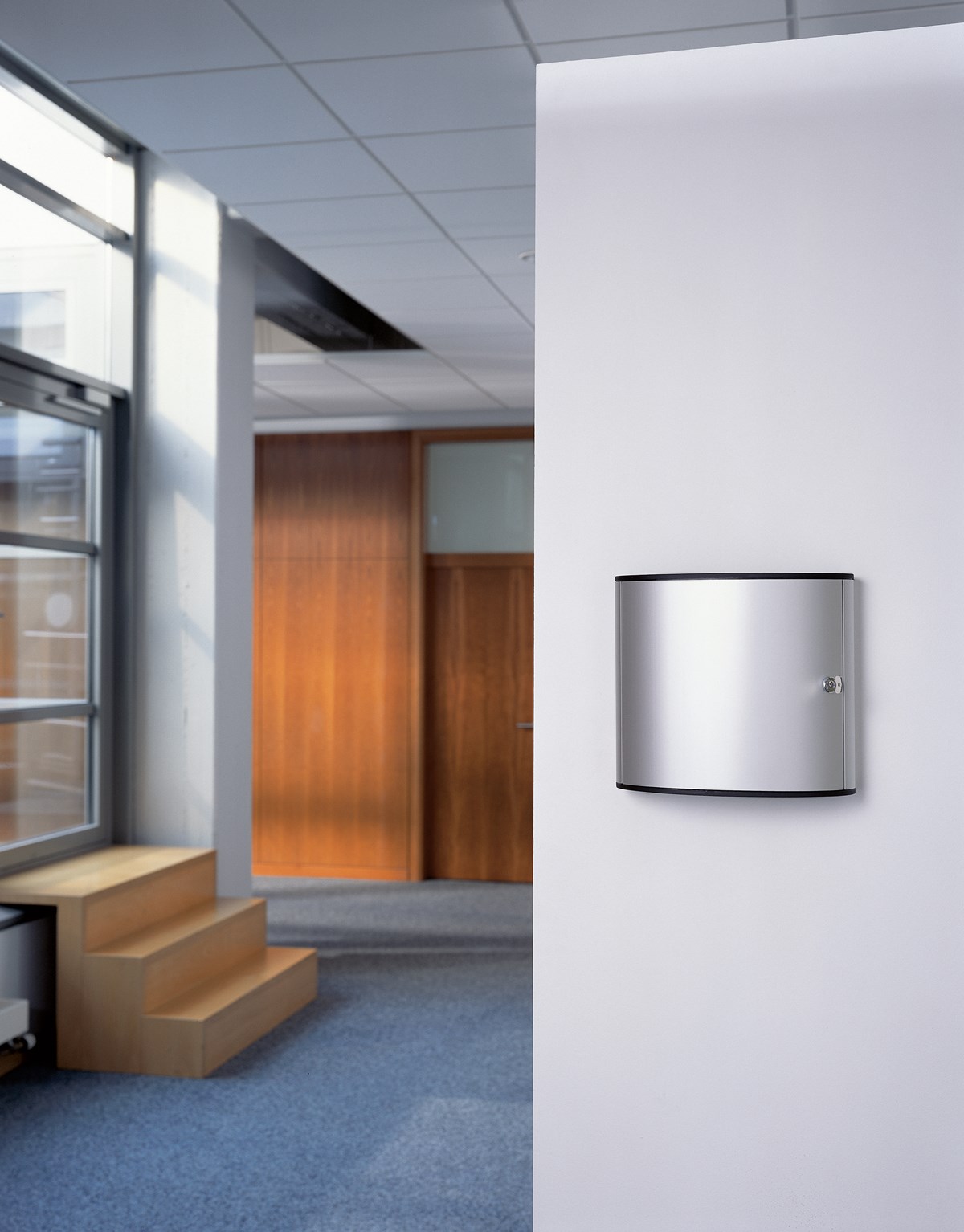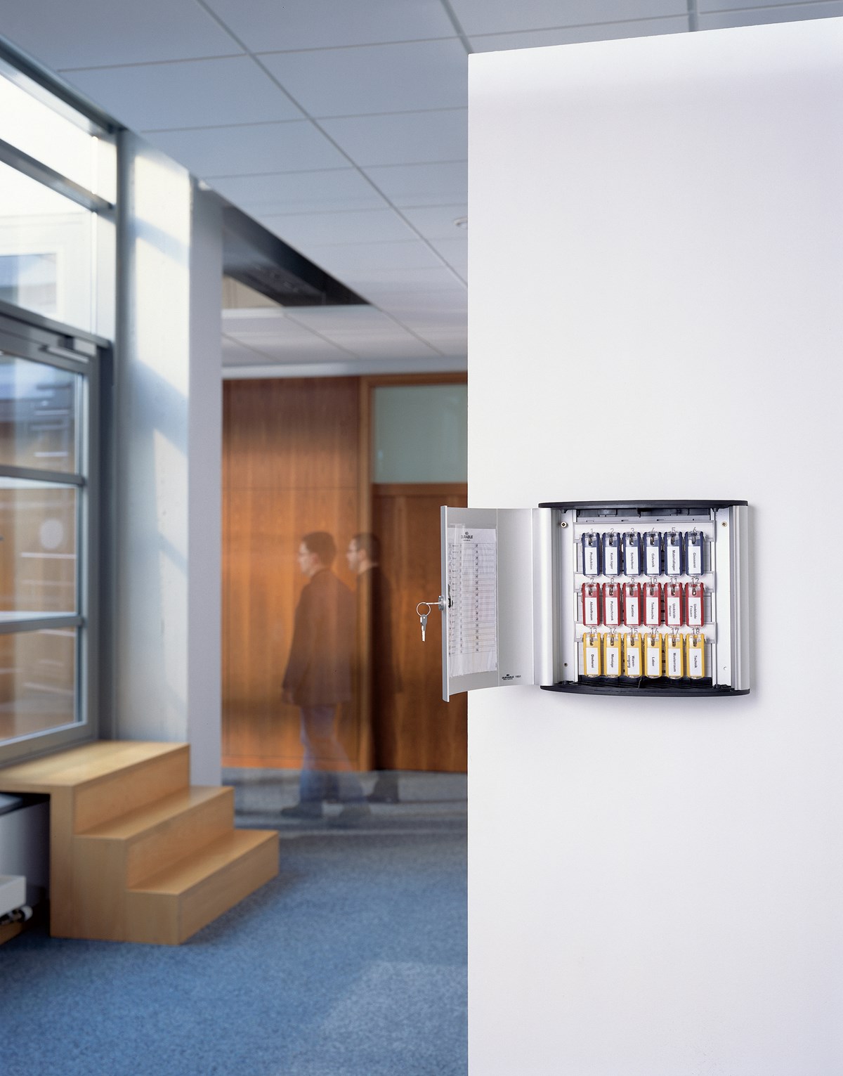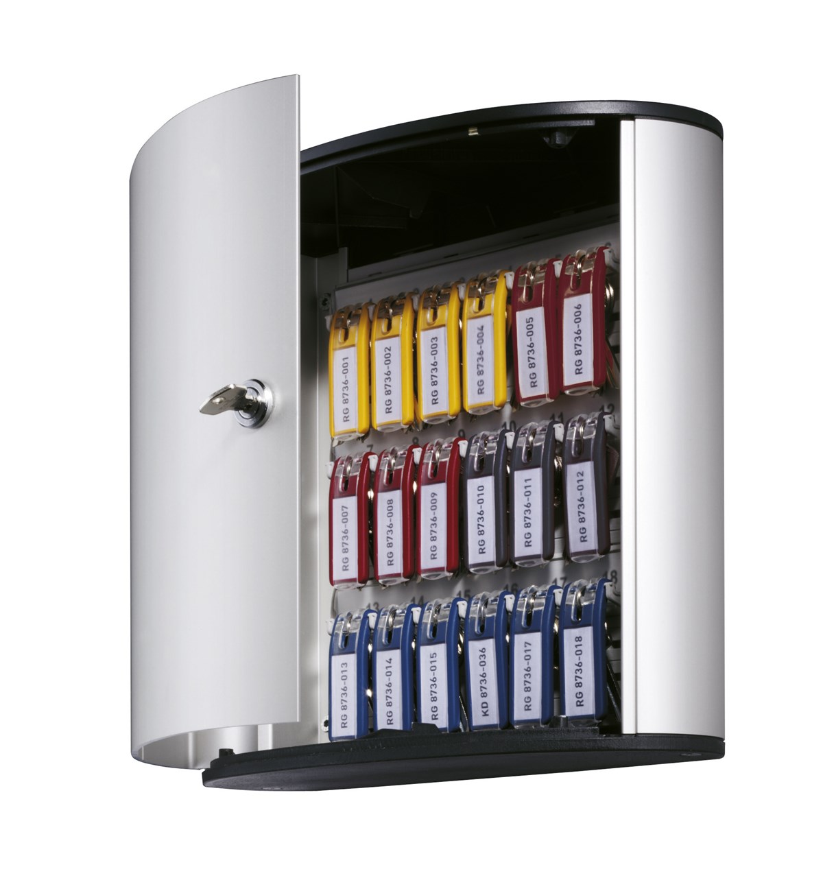 Skåp av aluminium. Cylinderlås med 2 nycklar. 6 st nyckelbrickor i blandade färger medföljer. Nyckeln hänger bakom brickan, vilket gör att etiketten alltid syns. Mallar för utskrift av etiketter till nyckelbrickor och nyckelförteckning kan laddas ner från www.durable.se.