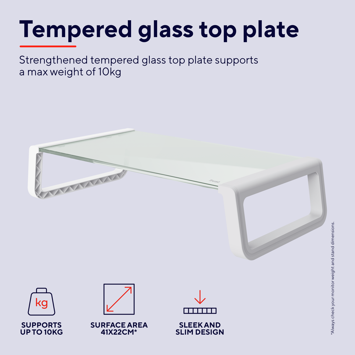 Stativ i härdat glas för skärm eller bärbar dator. Max belasning 10 kg. Mått: 415x225x98 mm.