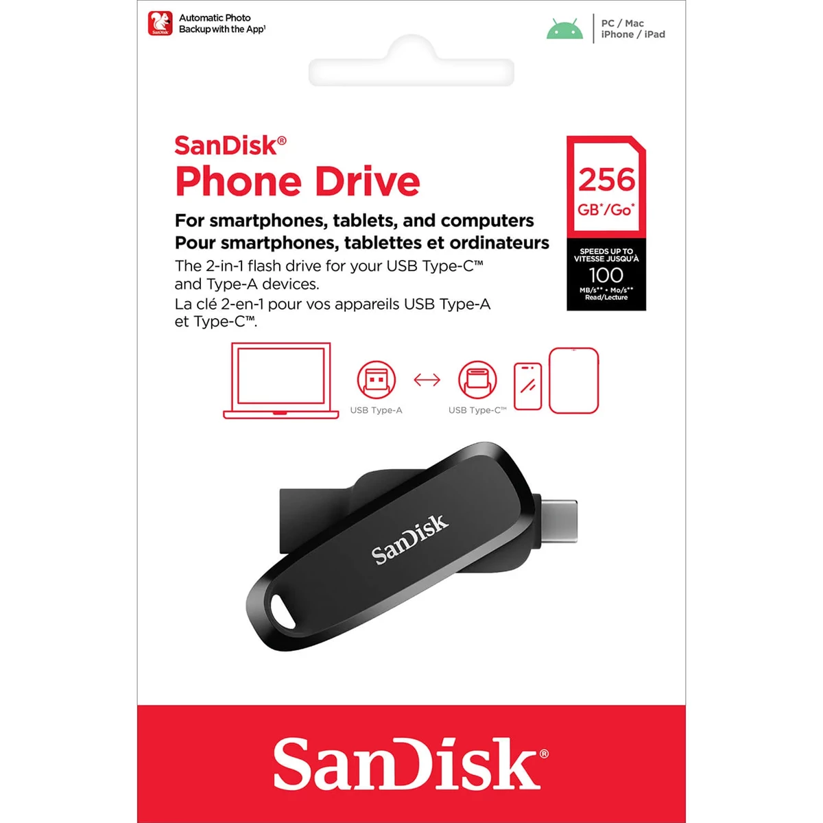 Upplev full flexibilitet med SanDisk Phone Drive, som är utformad för att fungera utan problem med dina USB Type-C- och Type-A-enheter. Oavsett om du använder en smartphone, surfplatta, Mac eller dator kan du med den här enheten sömlöst flytta filer mellan dem. Med läshastigheter på upp till 100 MB/s går det snabbt och effektivt att överföra filer, så att du kan ta fler foton och dela dem mellan dina enheter utan problem.