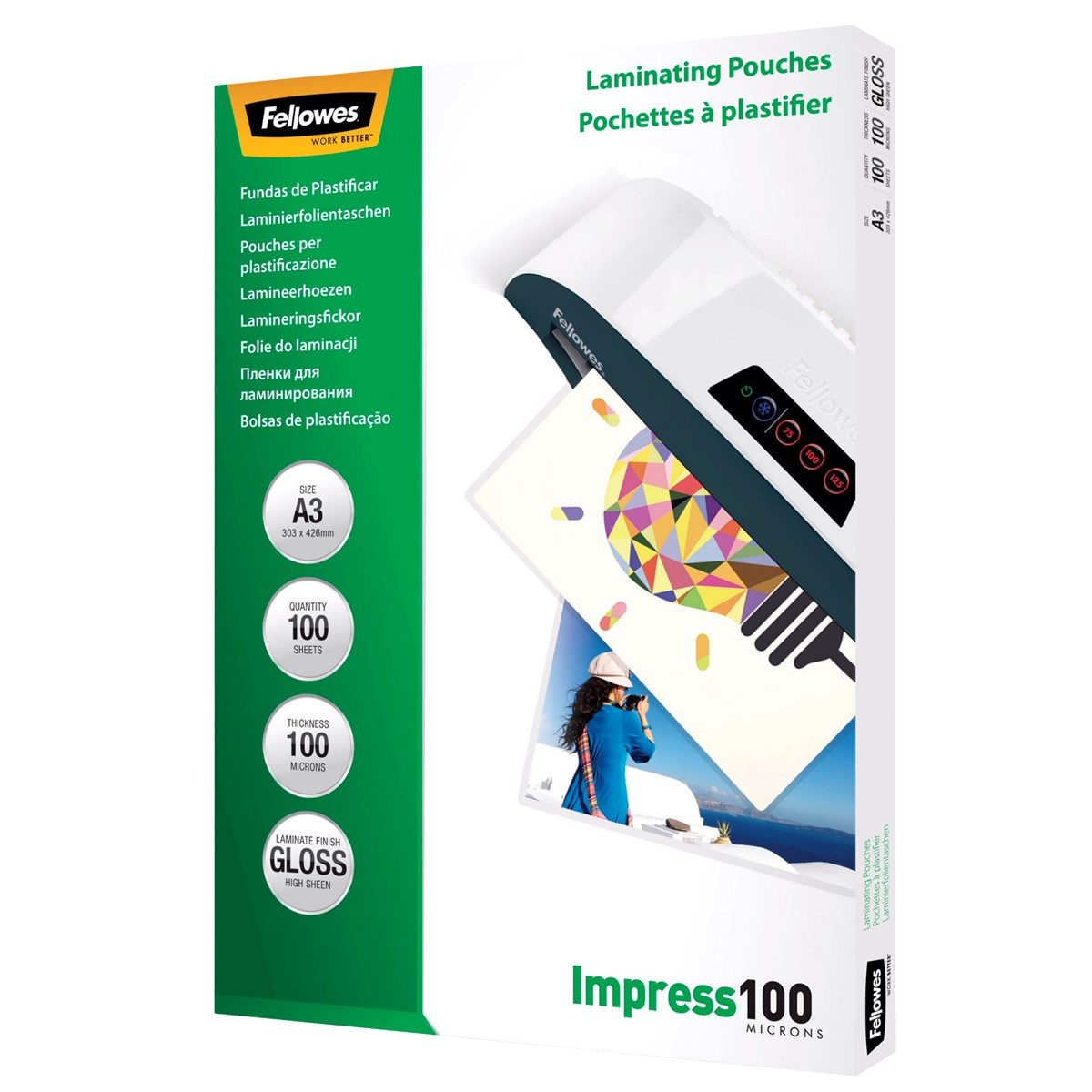 Premium Lamineringsfickor Fellowes med blank yta. Pilar visar åt vilket håll fickan ska vända - dessa försvinner när arket lamineras. Med en tjocklek på 100 mikron erbjuder dessa fickor en standardnivå av dokumentskydd. Lämplig för skyltning. Kan användas till alla lamineringsmaskiner oavsett märke.
