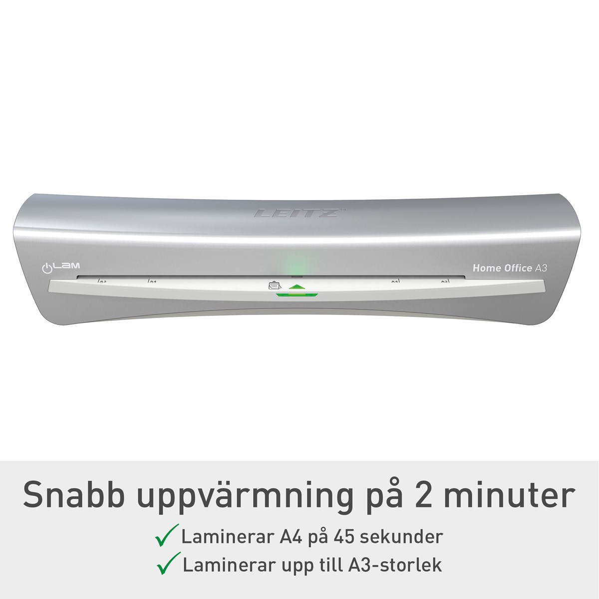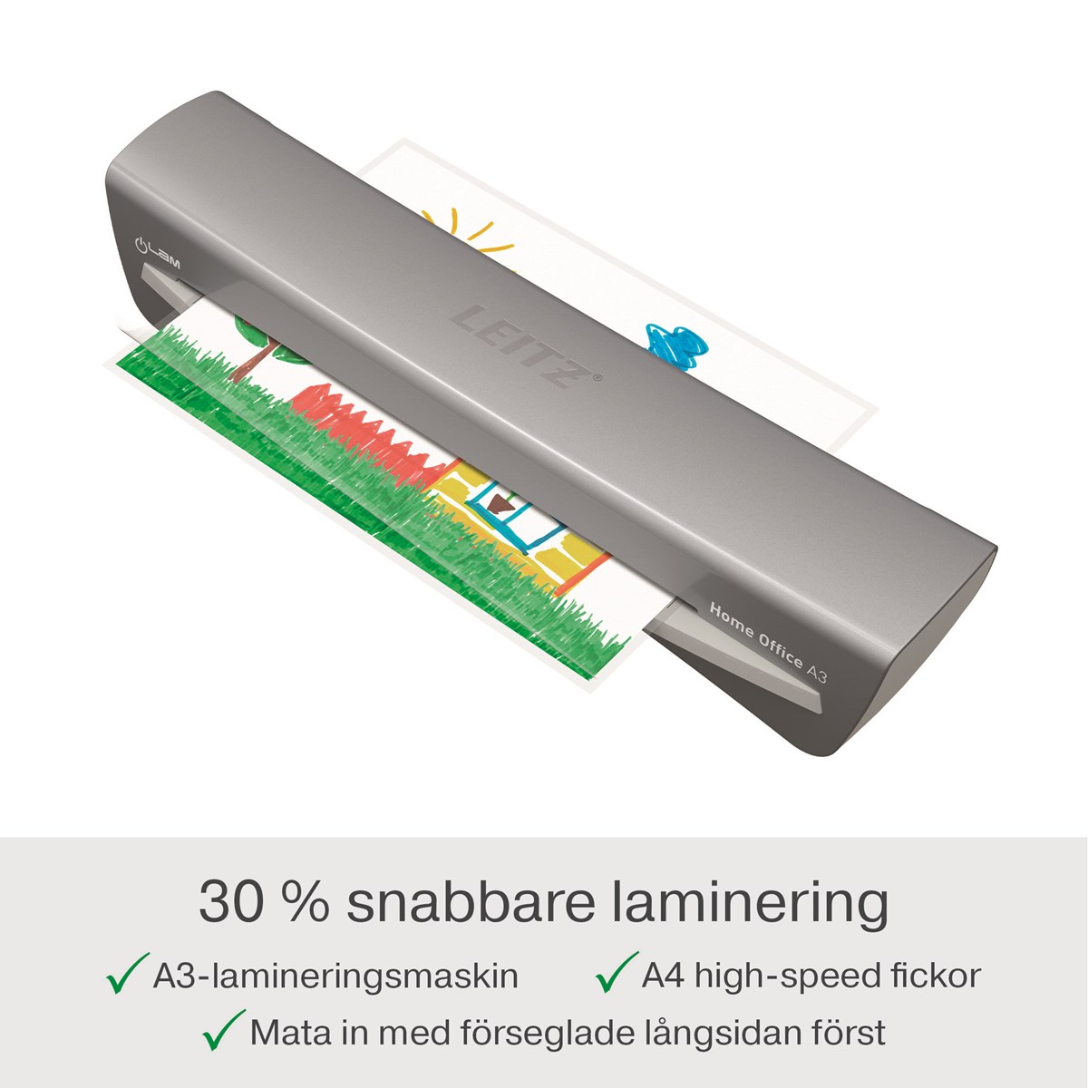 Klar att använda på bara 2 minuter med en snabb uppvärmningstid Laminerar ett A4 med 80 mikrometer på ca 45 sek. och är även kompatibel med A4-höghastighetsfickor Kompatibel med fickor från 75 till 125 mikron Minska energiförbrukningen med den automatiska standby-läget efter 15 minuter Innehåller ett startpaket med 5 x A4-fickor (80 mikron)