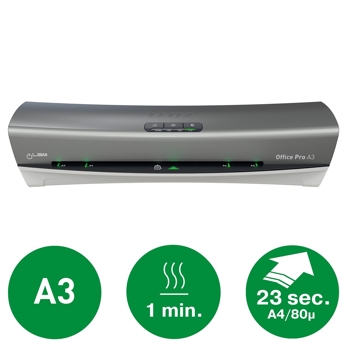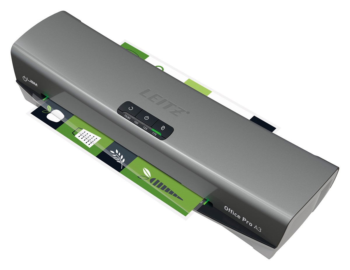 Den eleganta och sofistikerade lamineringsmaskinen Leitz iLAM Office Pro A3 kombinerar stil och hög prestanda på ett skickligt sätt. Denna A3-laminator är utformad för enkel användning och har en snabb uppvärmningstid på 1 minut och kan laminera ett A4-ark med 80 mikron på bara 23 sekunder, vilket ger ett snabbt och effektivt dokumentskydd.