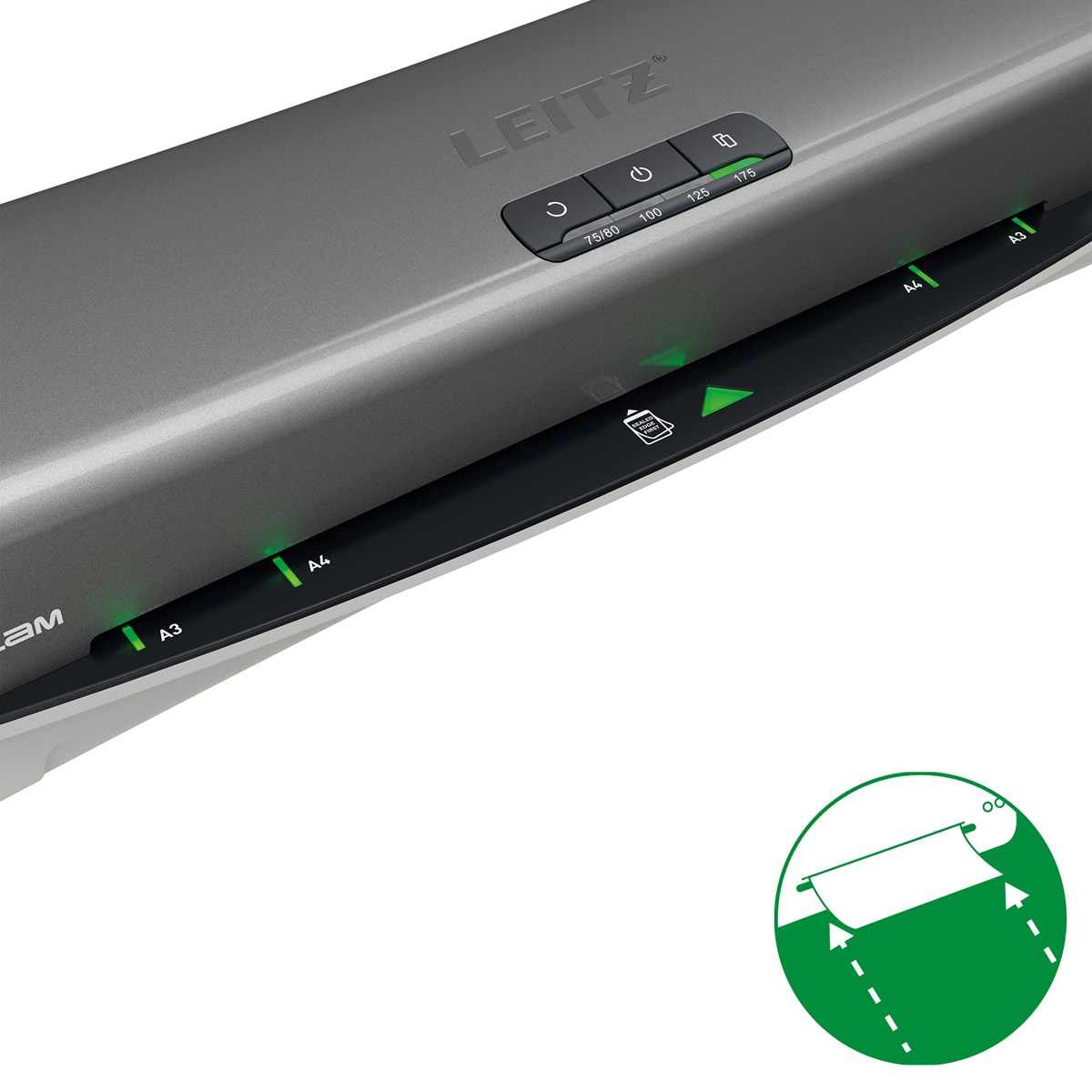 Den stilrena kontrollpanelen med belysta knappar ger enkel åtkomst till fyra inställningar för lamineringsfickans tjocklek. Den manuella anti-jam tillbaka-knappen med automatisk backning säkerställer problemfri drift genom att snabbt lösa eventuella stopp. Den innovativa smarta status-LED:n gör användningen enklare med intuitiva ljus och ljud: rött under uppvärmning, grönt med en ljudsignal när den är redo och blinkande rött för standby-läge efter 15 minuters inaktivitet. Dessutom säkerställer LED-lamporna SMART entry guide att lamineringsfickan är perfekt inriktad för att förhindra fastkörning.