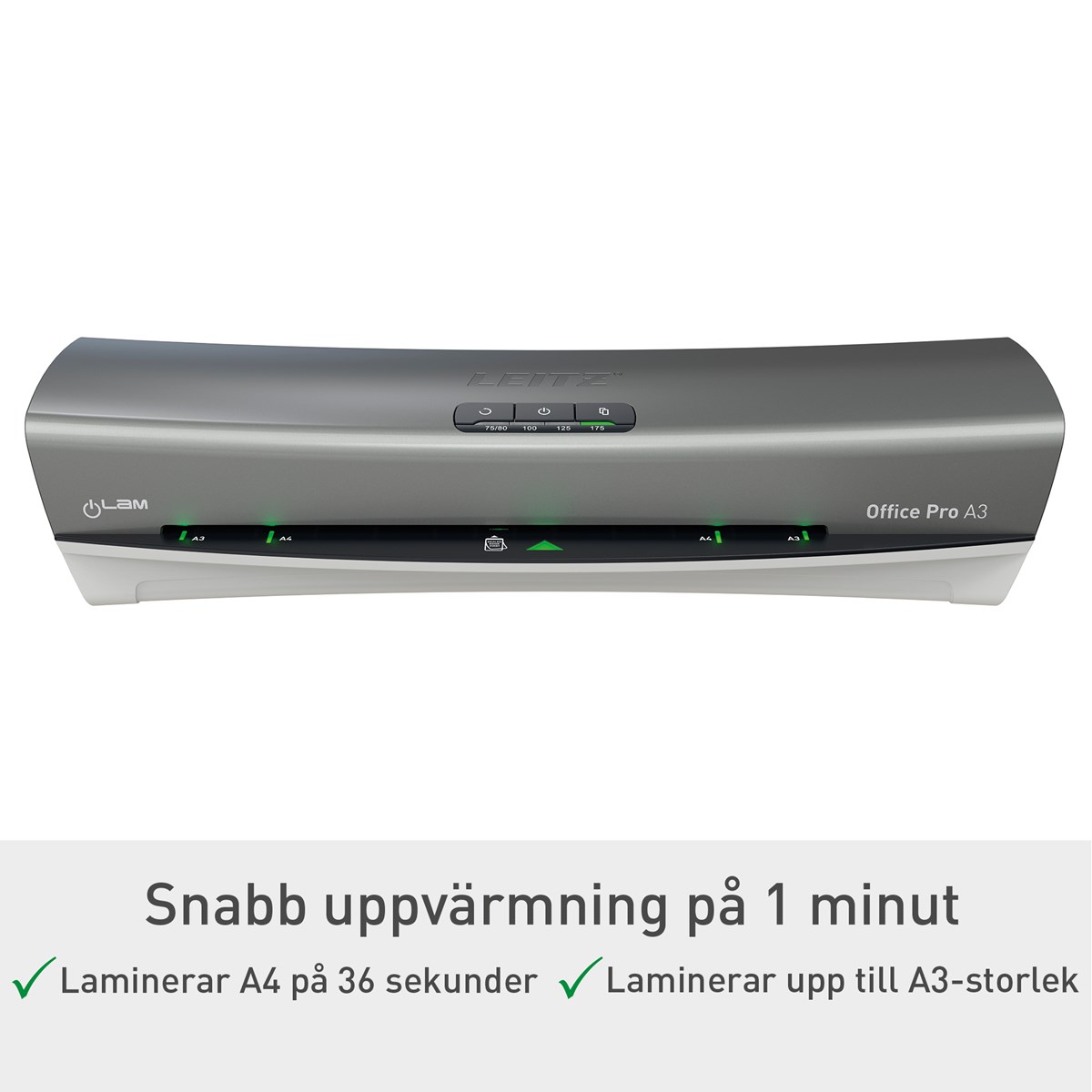 Klar att användas på bara 1 minut Laminerar ett A4 med 80 mikron på ca 23 sek. Intuitiva pekpanelen med backknapp som gör det enkelt att ta bort felmatade fickor Kompatibel med fickor från 75 till 175 mikron Innehåller ett startpaket med 5 x A4-fickor (80 mikron)