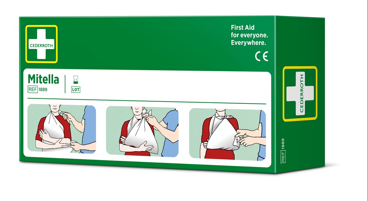 Cederroth Mitella knyts om halsen för stöd av en skadad arm. Kan också lindas runt huvudet för att hålla en kompress på plats vid huvudskada. Mått: 96 x 96 x 136 cm.