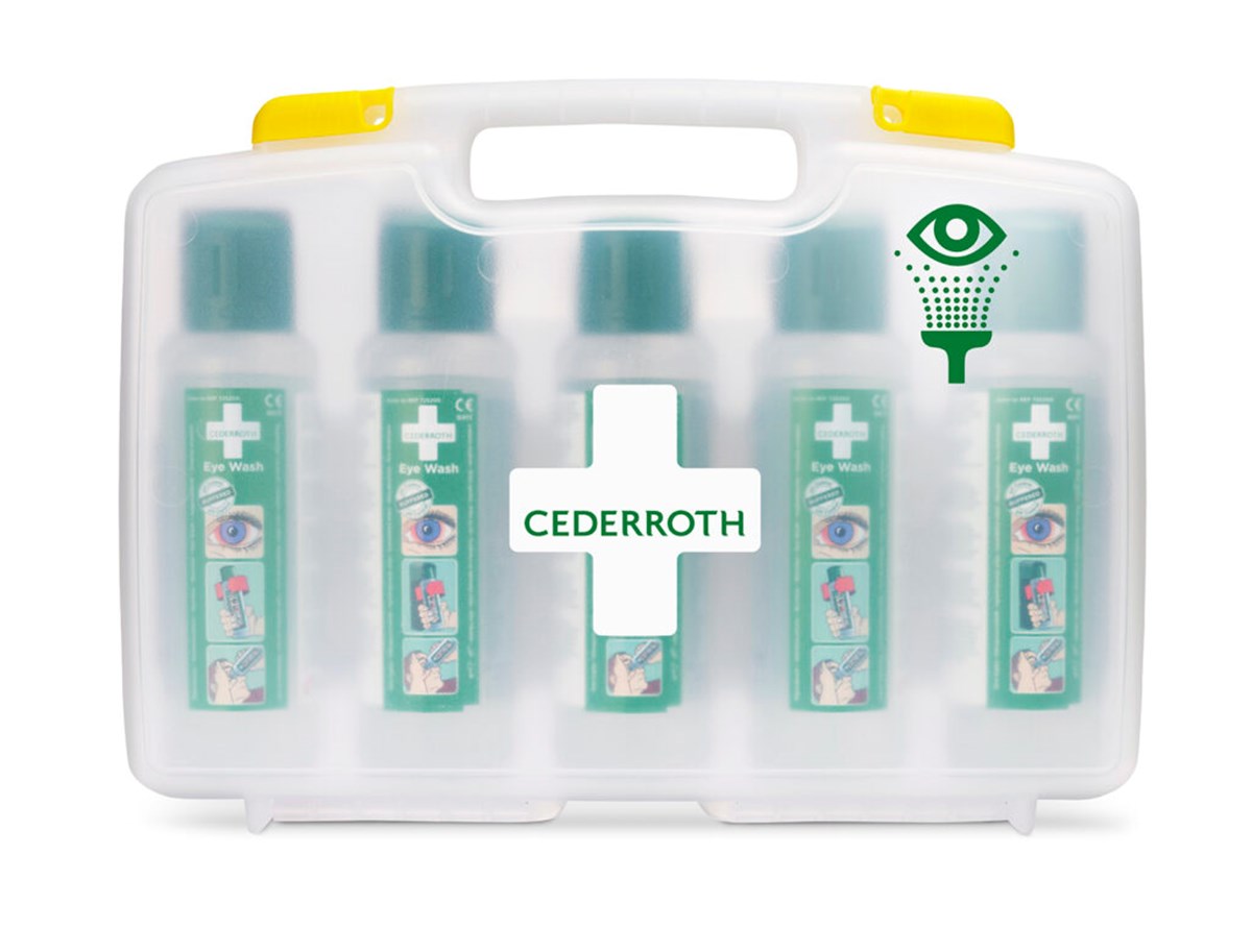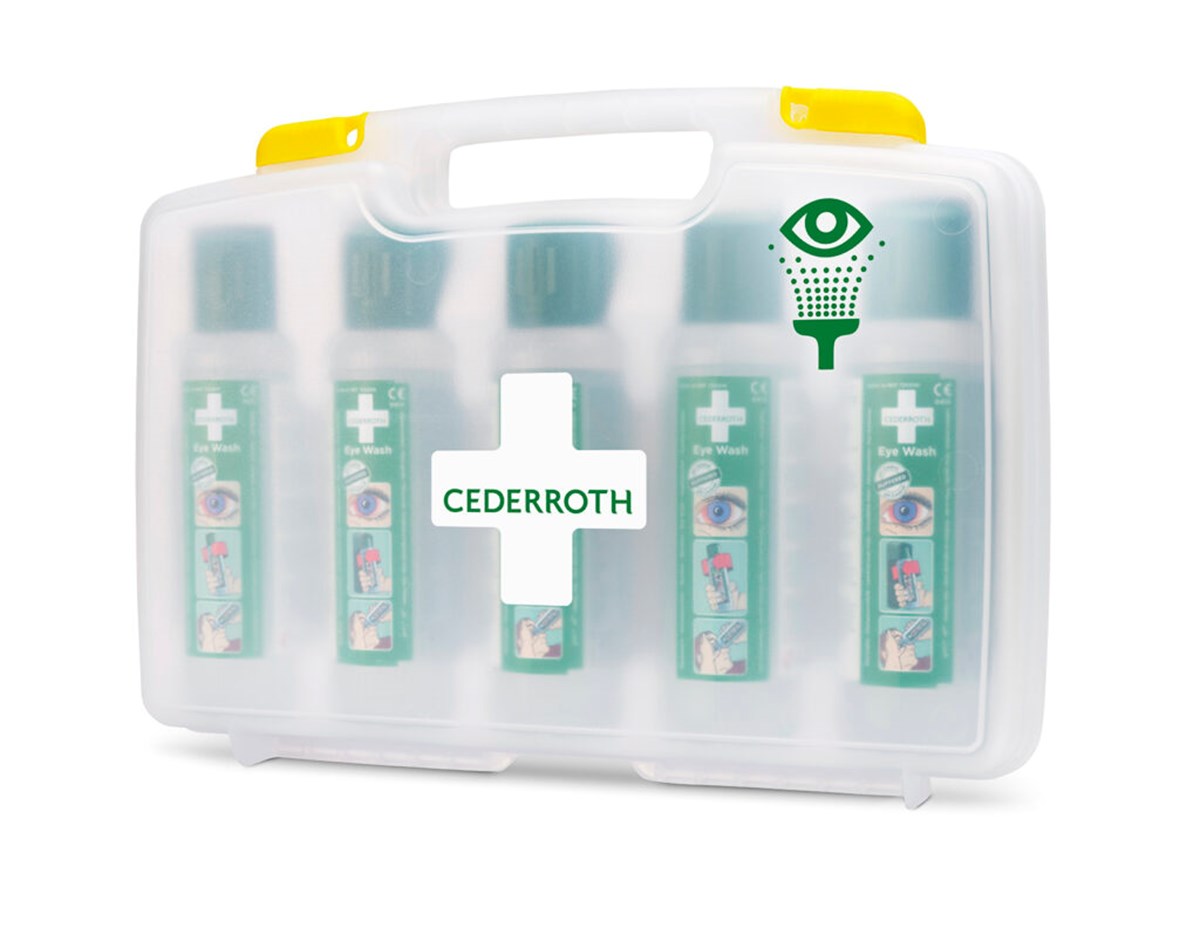 Cederroth Ögondusch (5 x 500 ml) i väska. Praktisk att bära med sig exempelvis vid mobilt arbete eller under transport till sjukhus. Robust transparent väska av hårdplast med handtag. Lätt att öppna med gula rejäla spännen som skjuts i sidled. Kan hängas på väggen med vägghållare (REF 51011041). Mått: 430 mm x 318 mm x 103 mm.