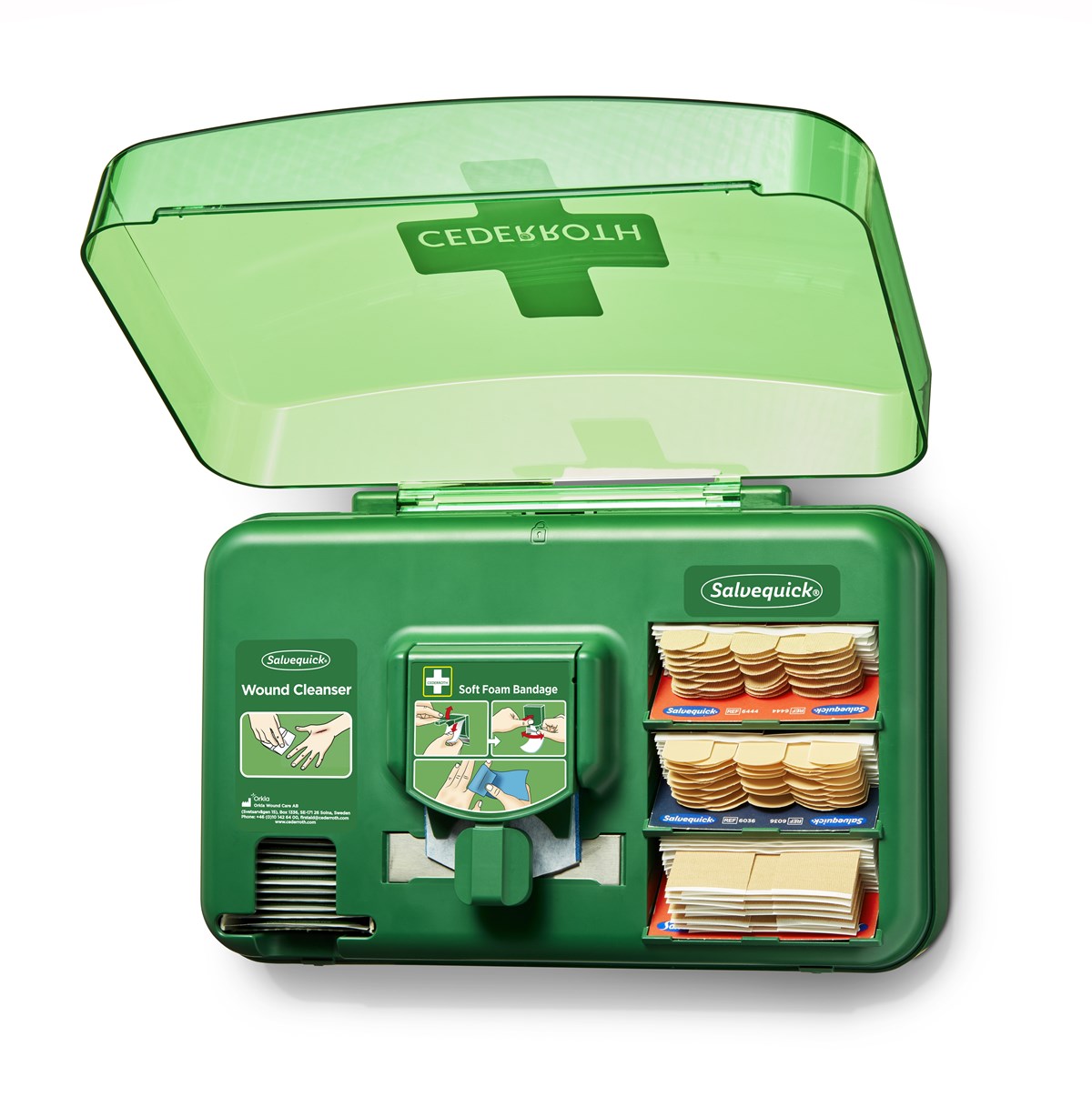 Innehåll: - Salvequick Sårtvättare, 40 st (REF 3227) - Cederroth Soft Foam Bandage Blue 4,5 m (REF 51011010) - Salvequick Textilplåster, 40 st (REF 6444) - Salvequick Plastplåster, 45 st (REF 6036) - Salvequick XL Textilplåster 21 st (REF 6470) - 1 Refillnyckel