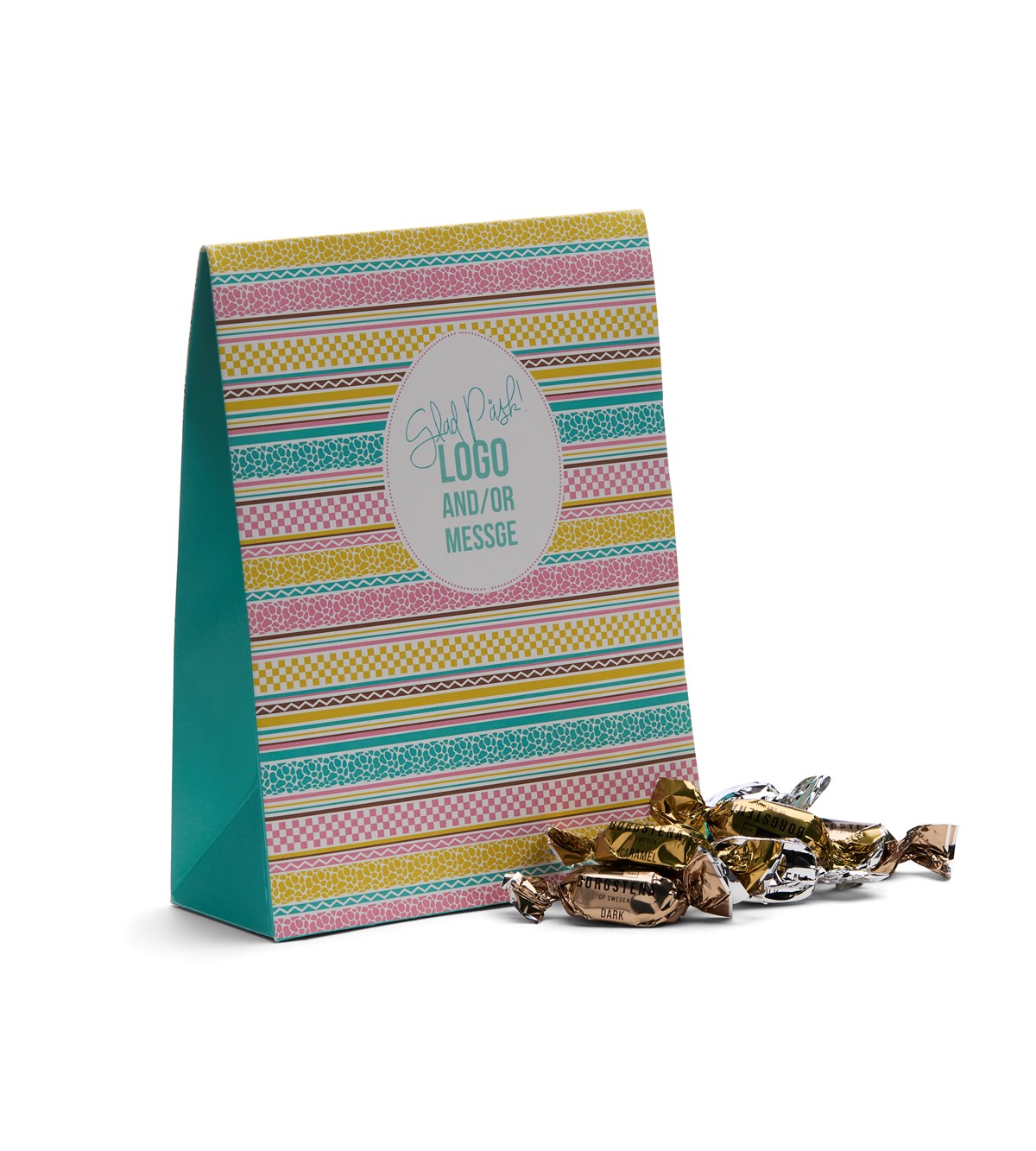 Trevlig presentpåse i randigt motiv fylld med vår goda och populära chokladmix som består av mjölkchoklad, mörk choklad och caramel. Tillverkad av certifierade äkta chokladbönor.
