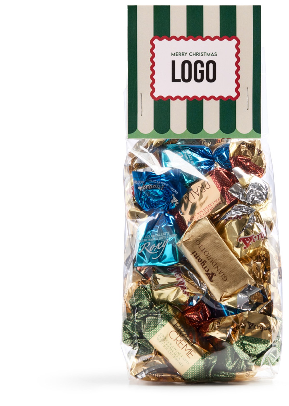 Cellofanpåse av återvunnen plast med ryttare i FSC-certifierat papper, fylld med ljuvliga italienska nougatpraliner som sprider julkänsla. Tryck din logga eller ditt budskap på produkten.
