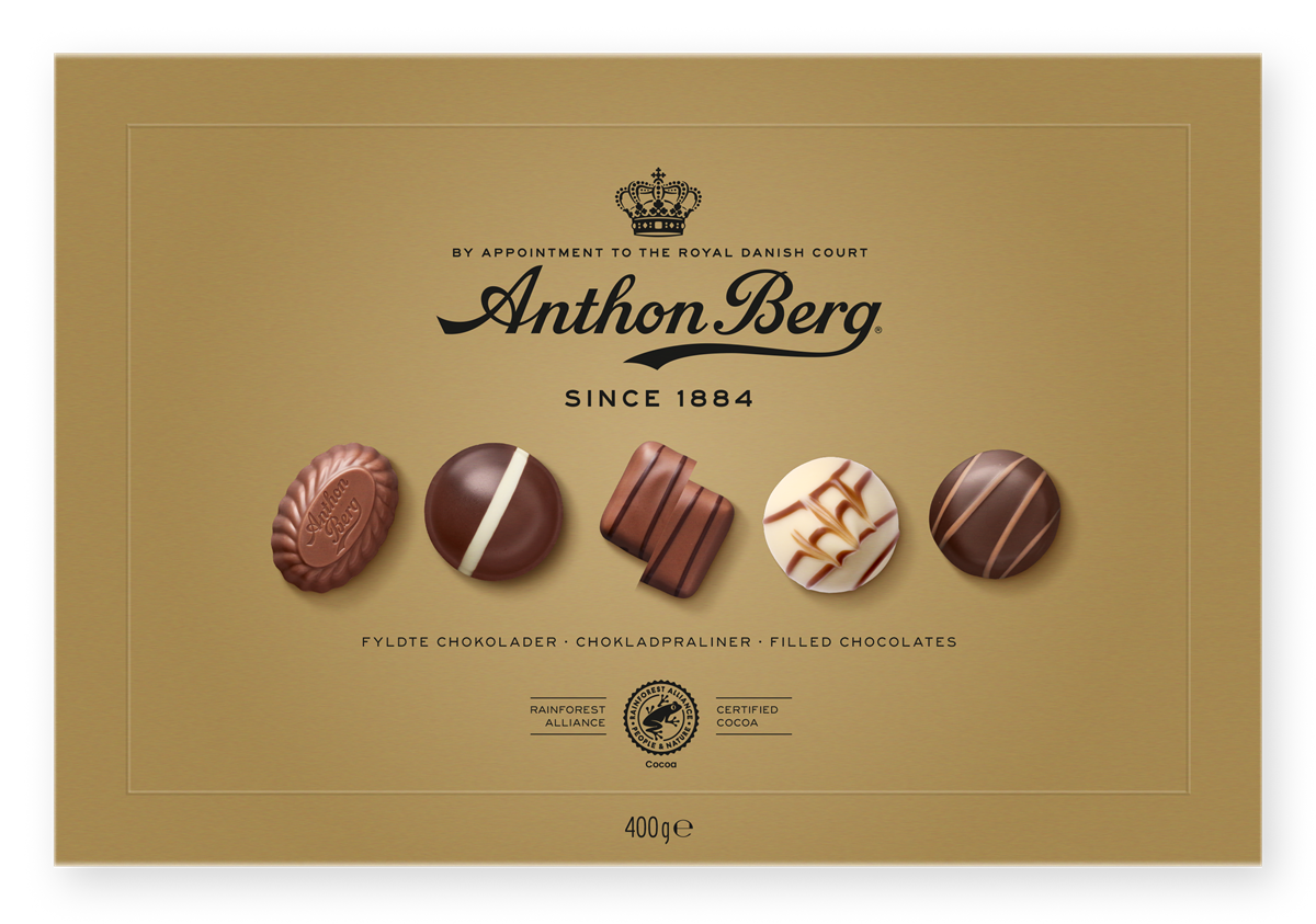 Anthon Bergs Guldask lanserades 1937 och var förmodligen Danmarks första presentask med choklad och den är idag danskarnas favorit. Den innehåller ett brett urval av klassiska fyllda praliner med marsipan, nougat, krämig karamell, kokos m.m. Asken med den ikoniska guldfärgen är en perfekt gåva till värdinnan, jubilaren eller en god vän.