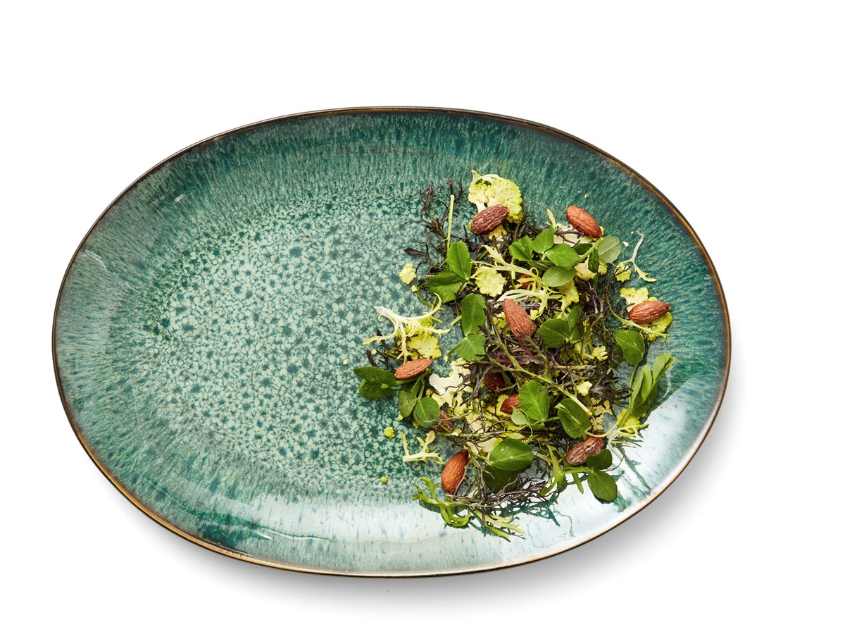 BITZ ovalt fat i svart stengods med matt reaktiv glasyr på utsidan kombinerat med en fin blank grön glasyr på insidan. Fatet är imponerande vackert till sallader och anrättningar. Fatet mäter 36 x 25 cm. Lämpligt till maskindisk.