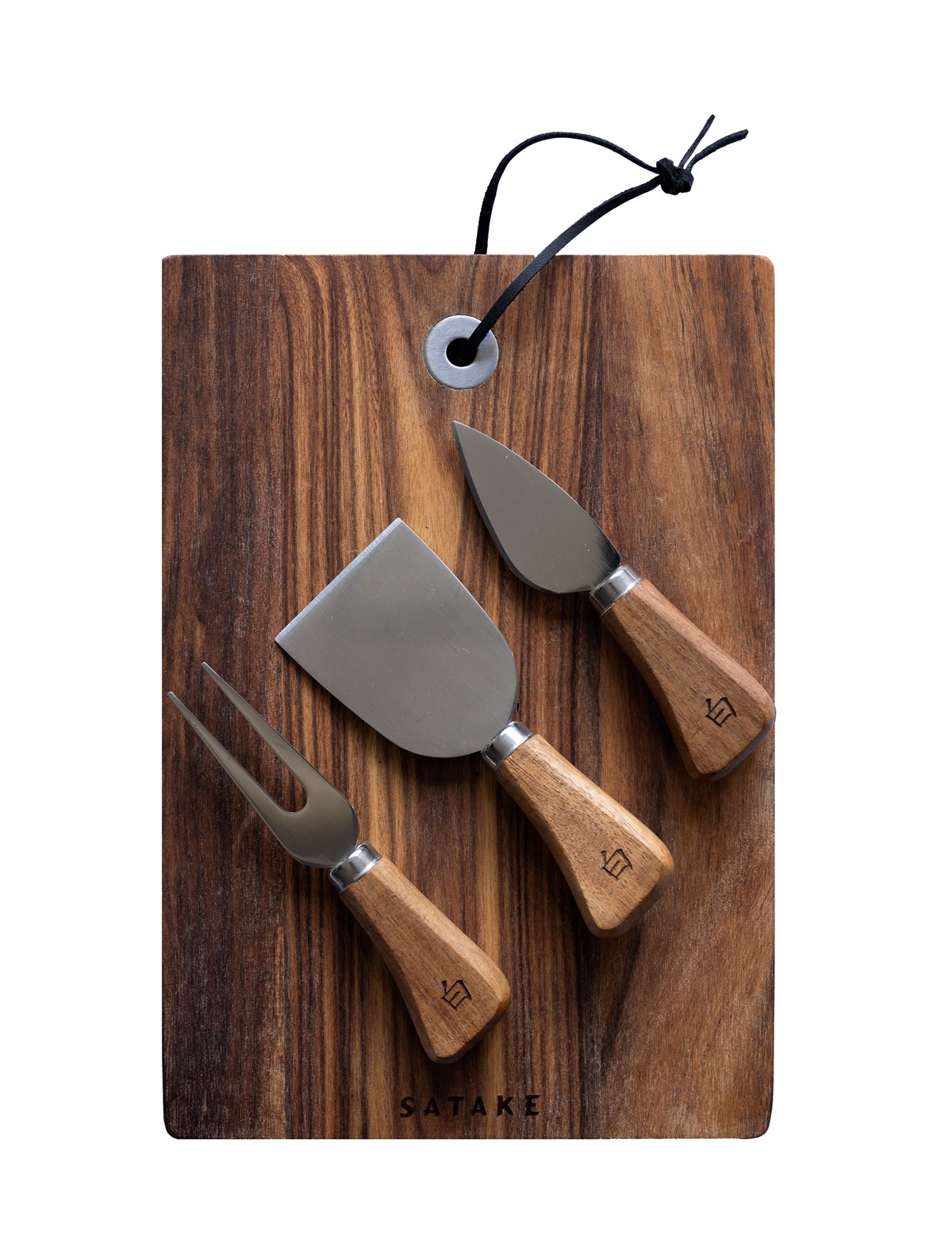 Satake Shiro ostset har en liten läcker skärbräda i akacia som är 17x25 cm med en mockarem för upphängning. Skärbrädan kommer i ett set med tre ost- & charkredskap. En kniv, en spatel och en gaffel i rostfritt stål med snyggt designade skaft av akaciaträ. Bladlängd 7 cm och skaftlängd 7 cm.