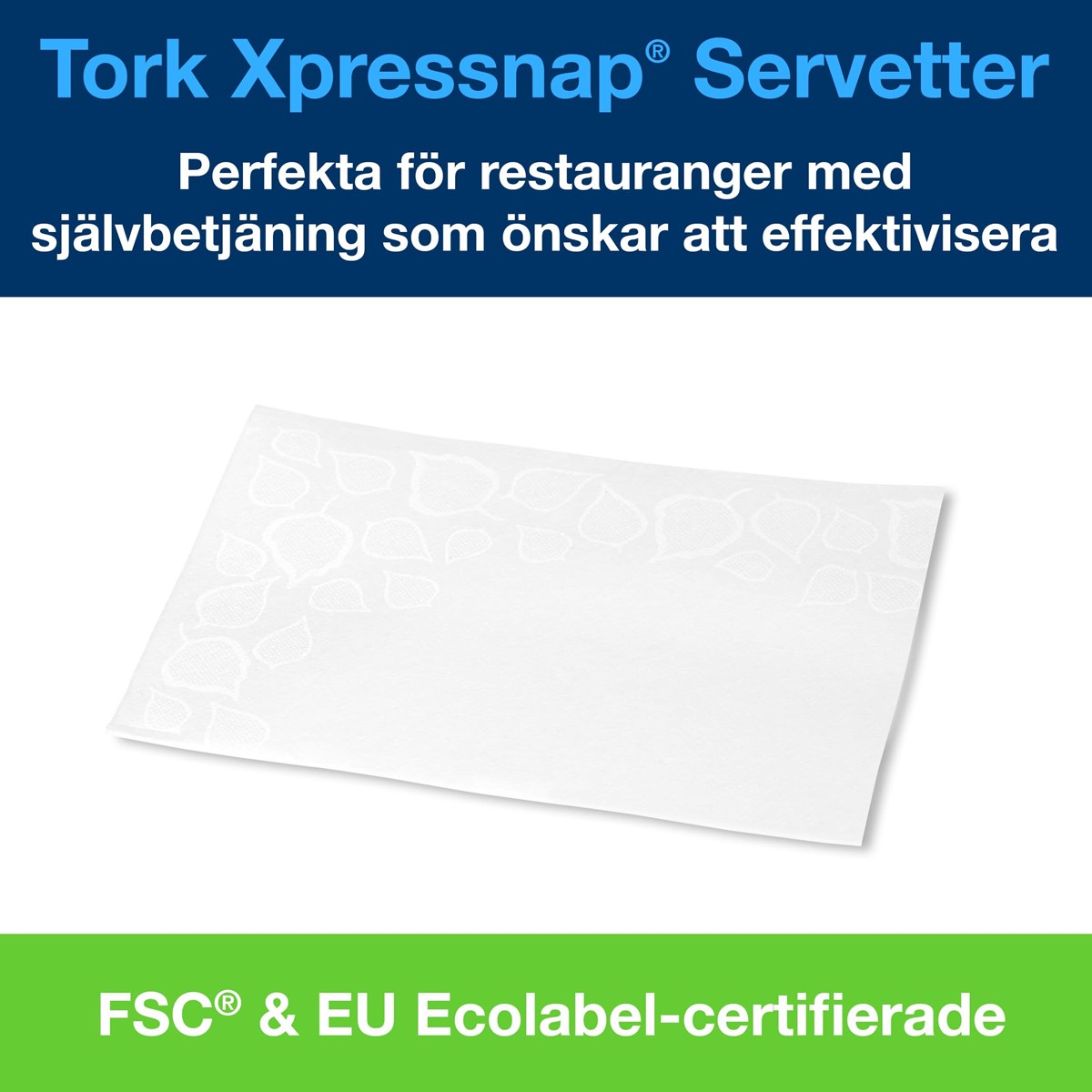 Tork Xpressnap Servettdispenser är ett utmärkt val för restauranger med självbetjäning. Med detta system kan du minska förbrukningen med 25% jämfört med traditionella servettdispensrar. Extra mjuka servetter med lövdekor av högsta kvalitet (Premium). Ligger vikta så att nästa ark automatiskt dras fram och ligger kvar för nästa person. 1/4-vikta, 2-lags. Format: 21,3 x 33 cm. 500 st/förp. 8 förp./kartong.