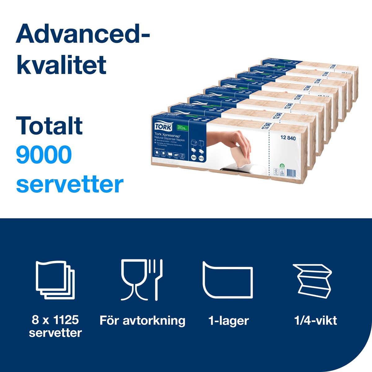 Tork Xpressnap Servettdispenser är ett utmärkt val för restauranger med självbetjäning. Med detta system kan du minska förbrukningen med minst 25% jämfört med traditionella servettdispensrar. Naturfärgade servetter av 100% återvunnet material. Biologiskt nedbrytbara och komposterbara. Servetterna ligger vikta så att nästa ark automatiskt dras fram och ligger kvar för nästa person. 1/4-vikta, 1-lags. Format: 21,3 x 33 cm. 1125 st/förp. 8 förp./kartong.