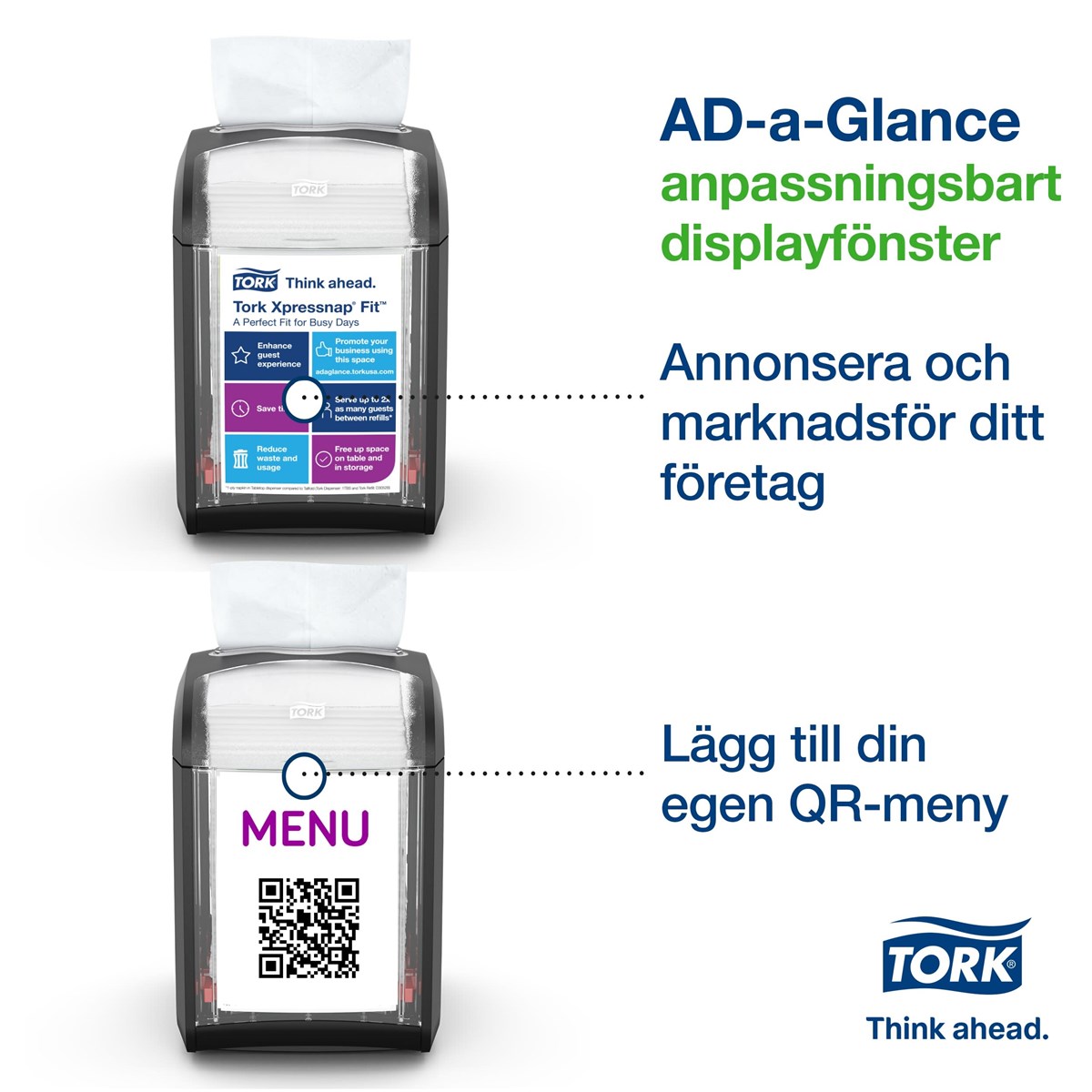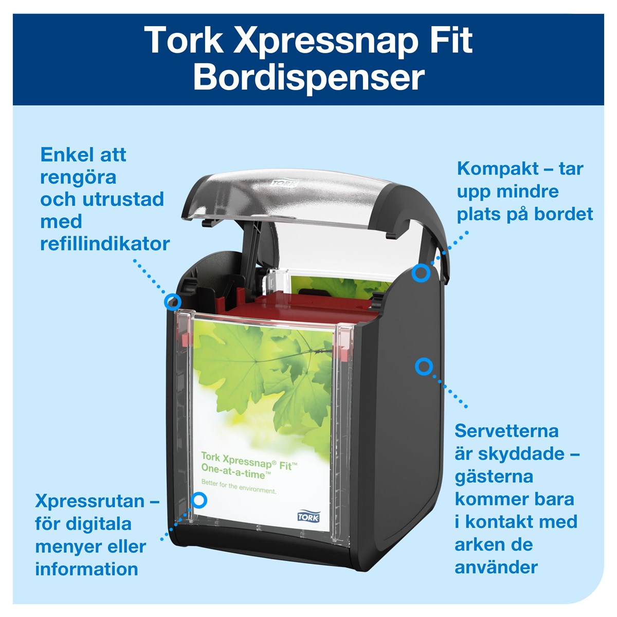 Kompakt dispenser som rymmer fullstora servetter och tar liten plats på bordet Refillindikatorn visar när det är dags att fylla på dispensern Den kompakta refillförpackningen minskar behovet av lagerutrymme Reklamfönster