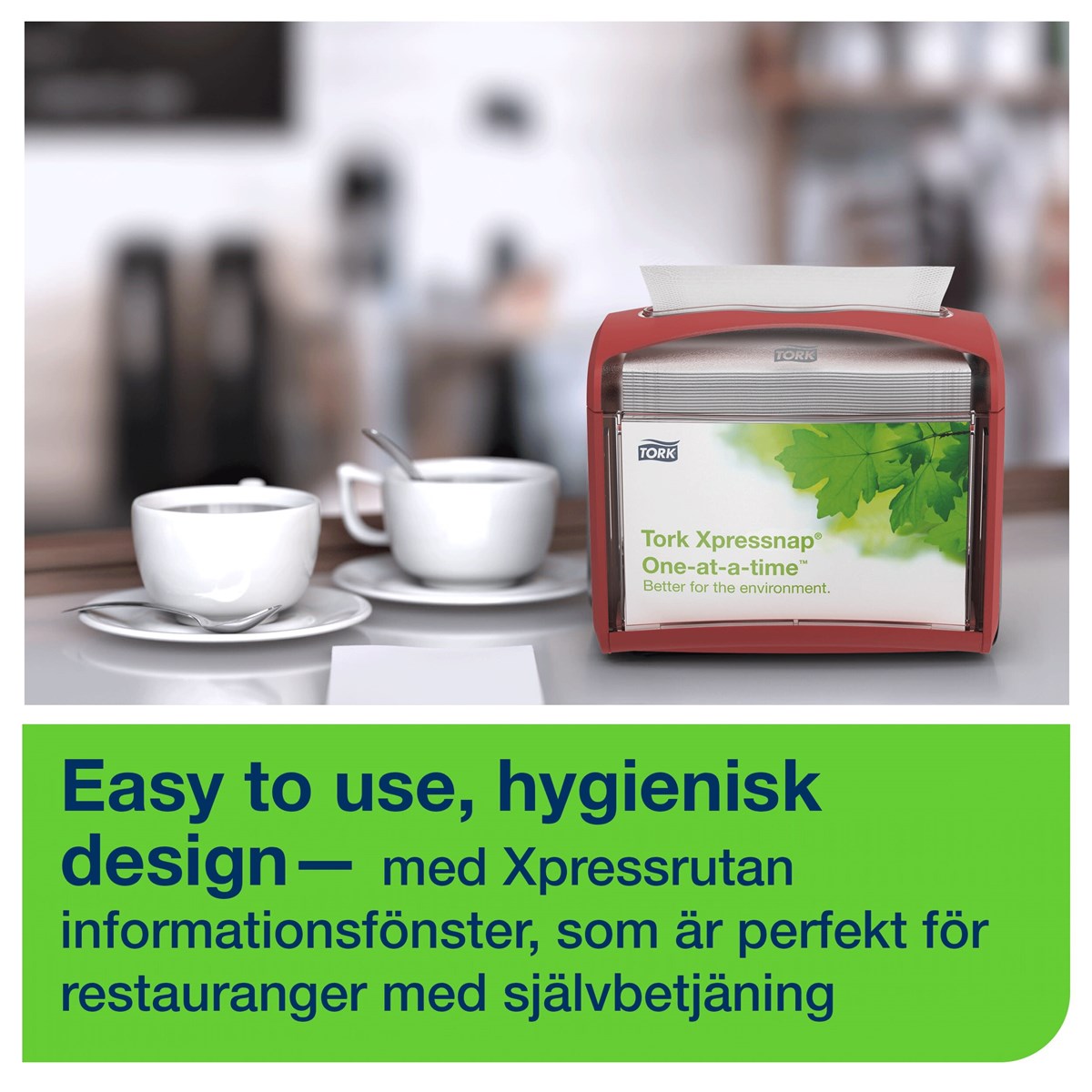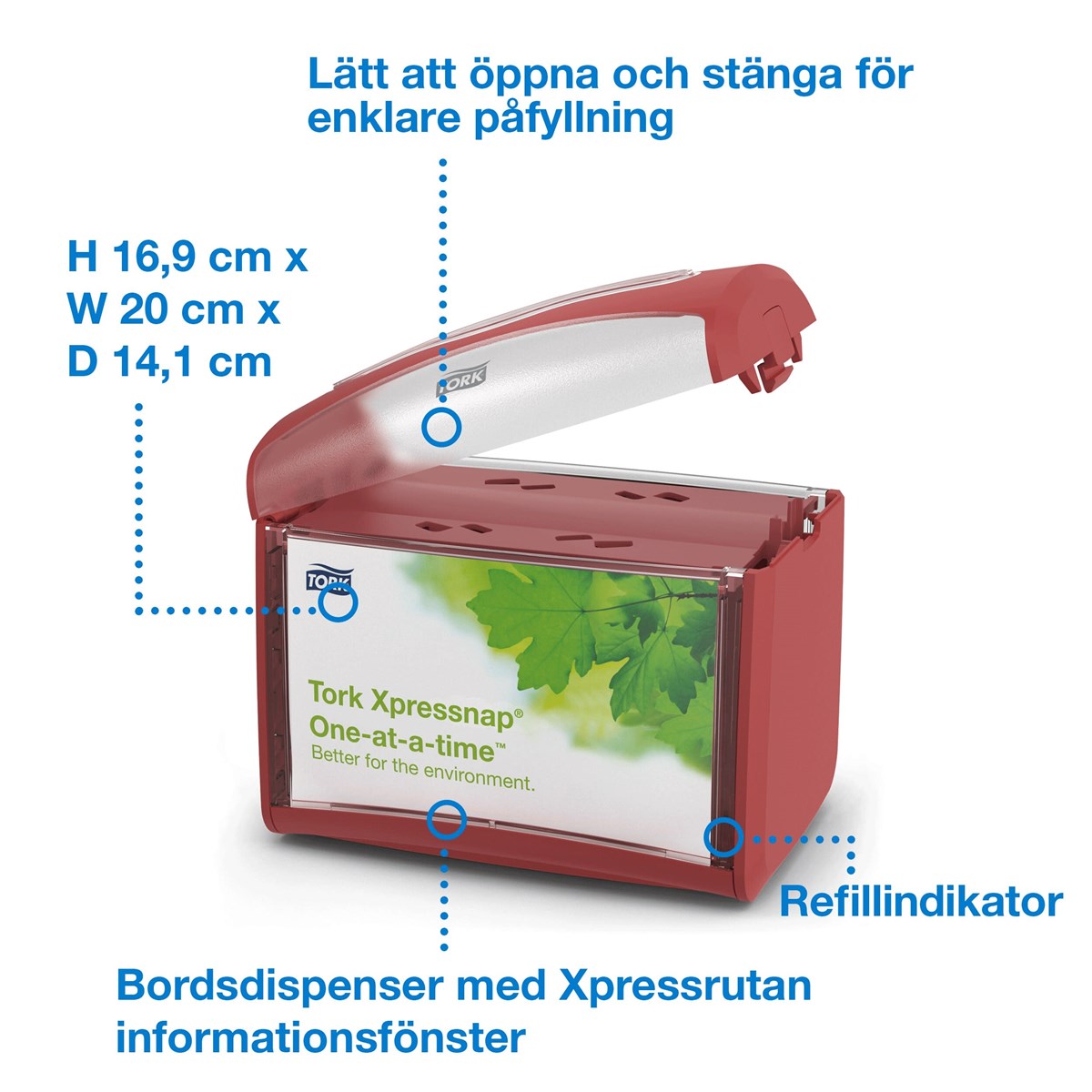 Kompakt och modern design Hållbara och lättskötta material för mindre underhåll Anpassningsbart informationsfönster för reklam eller instruktioner till personal Utmatning av ett ark i taget, förbättrar hygienen och minskar förbrukningen Brett urval av färger