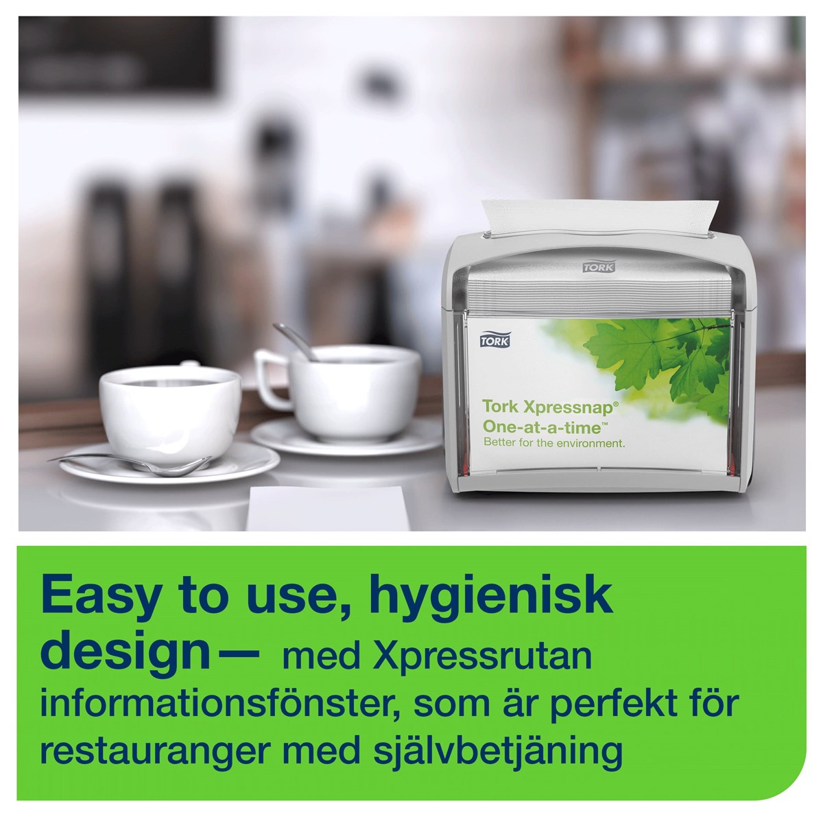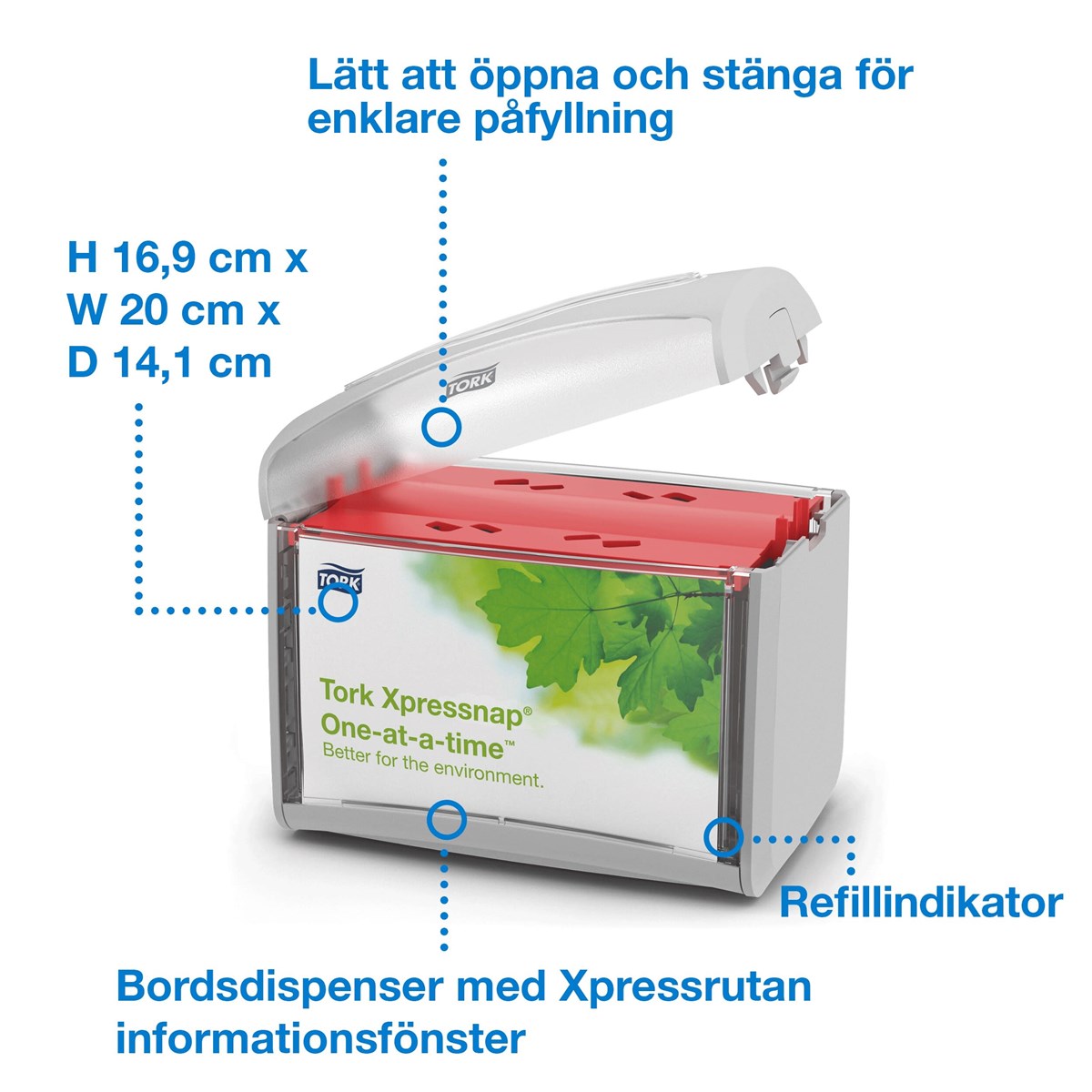 Kompakt och modern design Hållbara och lättskötta material för mindre underhåll Anpassningsbart informationsfönster för reklam eller instruktioner till personal Utmatning av ett ark i taget, förbättrar hygienen och minskar förbrukningen Brett urval av färger