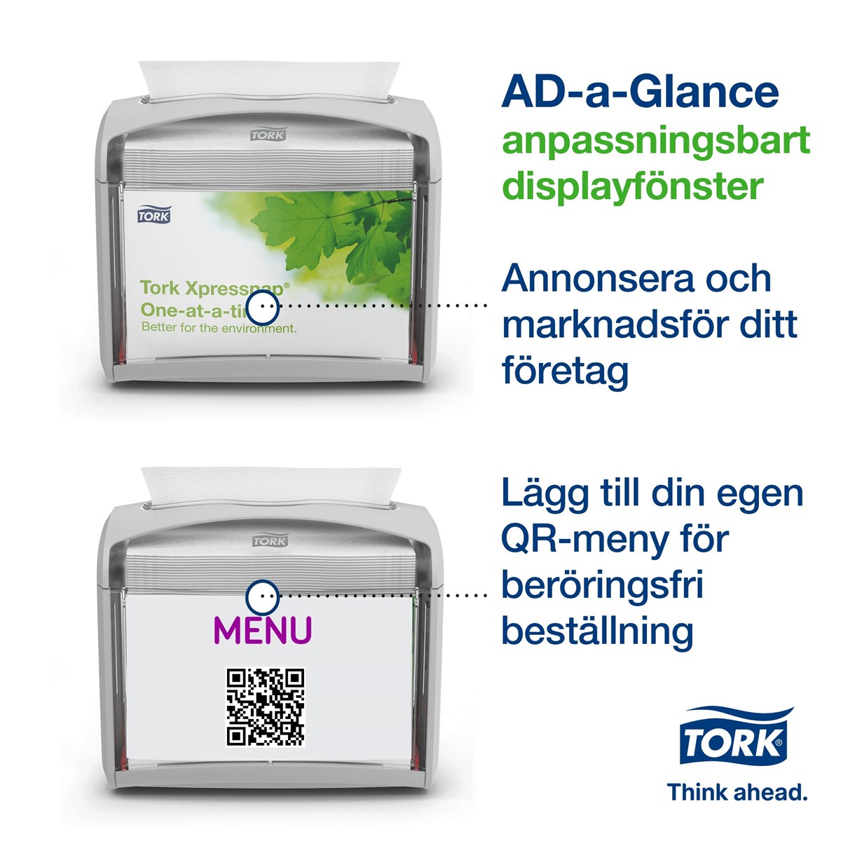 Smidig, toppmatad servettdispenser. Utmärkt för bord och diskar. Placera eget budskap i reklamrutan. Rymmer 275 st N4-servetter. Format: H15,5 x B20,1 x D14,6 cm.