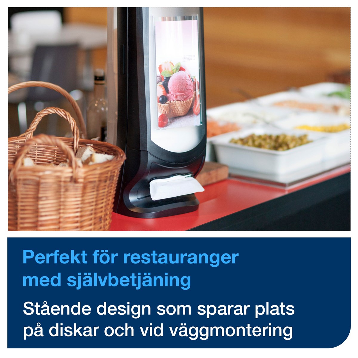 Stående design som spar plats på disken Enkel väggmontering Fönster för reklam eller personalinstruktioner Ett ark i taget för förbättrad hygien och minskad förbrukning Slitstark och enkel att rengöra