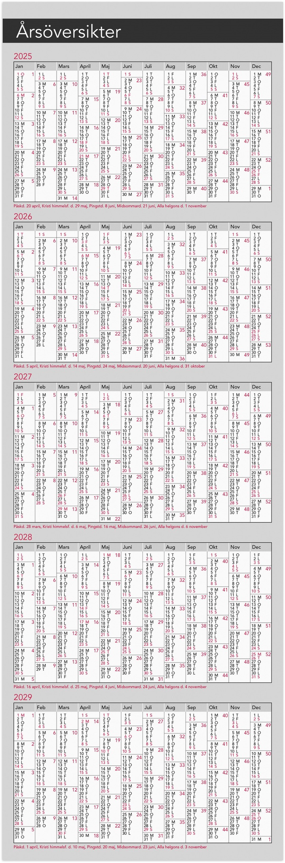 Format: 120x366 mm. Layout: År/blad. Kalendarium: 2026-01-01 - 2026-12-31. Innehåll: Kyrkliga helgdagar, Flaggdagar, Helgdagar, Månfaser, Namnsdagar, Årsöversikter föregående, innevarande och de tre följande åren. Antal sidor: 2. Miljöinformation: FSC®. Ecolabel.