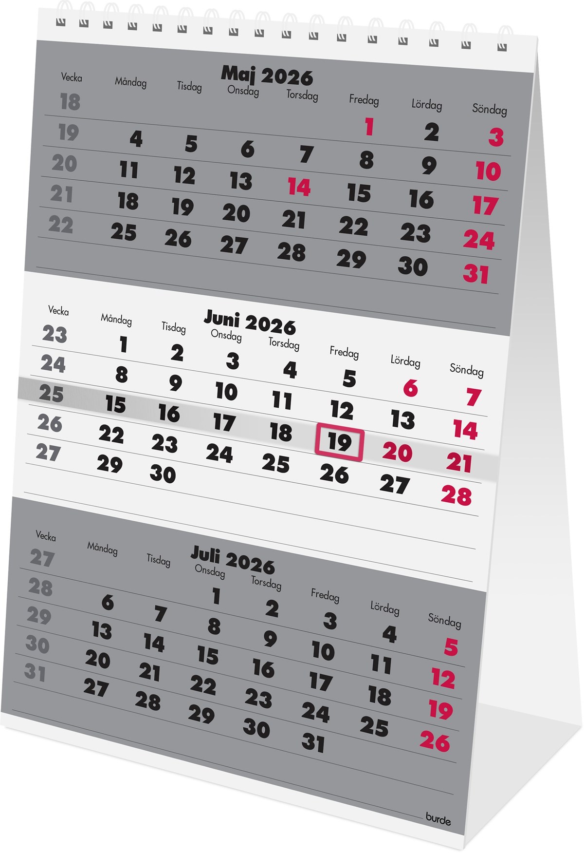 Format: A5. Layout: Tre månader/blad. Kalendarium: 2026-01-01 - 2026-12-31. Spiralbunden. Antal sidor: 12. Miljöinformation: FSC®.