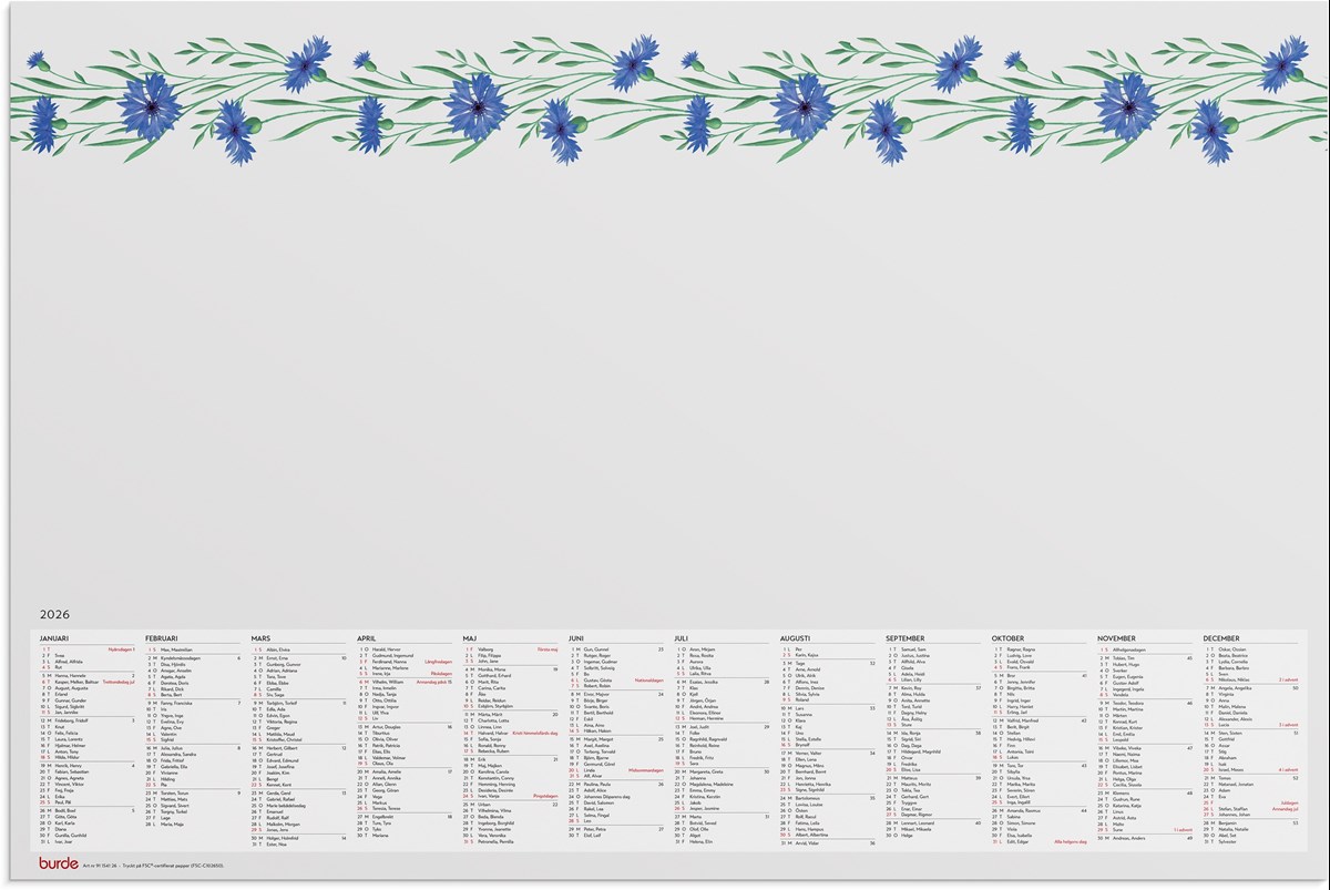 Format: 600x400 mm. Layout: År/blad. Kalendarium: 2026-01-01 - 2026-12-31. Limbunden. Innehåll: Helgdagar, Namnsdagar. Antal sidor: 20. Miljöinformation: FSC®.