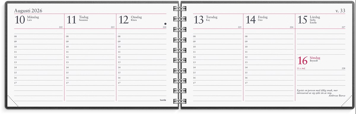 Format: 148x90 mm. Layout: Stående. Vecka/uppslag. Timindelning 8-17. Kalendarium: 2025-12-15 - 2027-01-03. Omslag: Återvunnen kartong. Spiralbunden. Innehåll: Inbundet telefonregister, Kyrkliga helgdagar, Flaggdagar, Helgdagar/aftnar, Månfaser, Namnsdagar, Internationella helgdagar översikt, Temadagar/händelser, Årsöversikt/årsöversikter, Årsplan/årsplaner. Antal sidor: 144. Miljöinformation: FSC®. Omslag i återvunnen kartong.