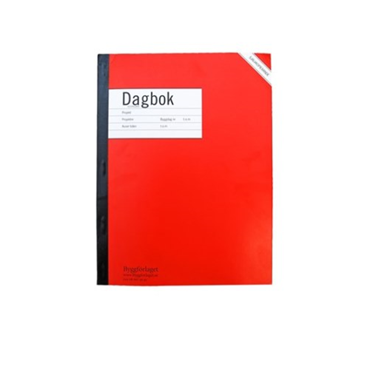 Byggarbetsplatsdagbok i A4-format för dokumentation av entreprenad. AB 04 anger att byggentreprenören ska föra dagbok över omständigheter av betydelse för entreprenaden. Uppgifter som förs i dagboken är t.ex. påbörjade, pågående och färdiga arbeten samt avvikelser, störningar, ändringsarbeten och väderlek, arbetsstyrka m.m. Dagboken skrivs i självkopierande rapportset (original + 2 kopior). Dagboken innehåller även Skyddsrondsprotokoll för var sjätte dag. Checklista till skyddsronden ingår i dagboken.