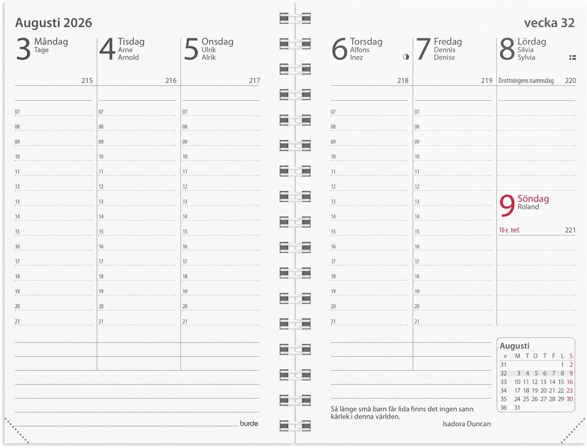 Format: 83x127 mm. Layout: Stående. Vecka/uppslag. Timindelning 7-21. Kalendarium: 2025-12-08 - 2027-01-03. Omslag: Kartong. Spiralbunden. Innehåll: Atlas, Kyrkliga helgdagar, Flaggdagar, Helgdagar/aftnar, Månfaser, Namnsdagar, Internationella helgdagar översikt, Temadagar/händelser, Årsöversikt/årsöversikter, Årsplan/årsplaner. Antal sidor: 152. Miljöinformation: FSC®.