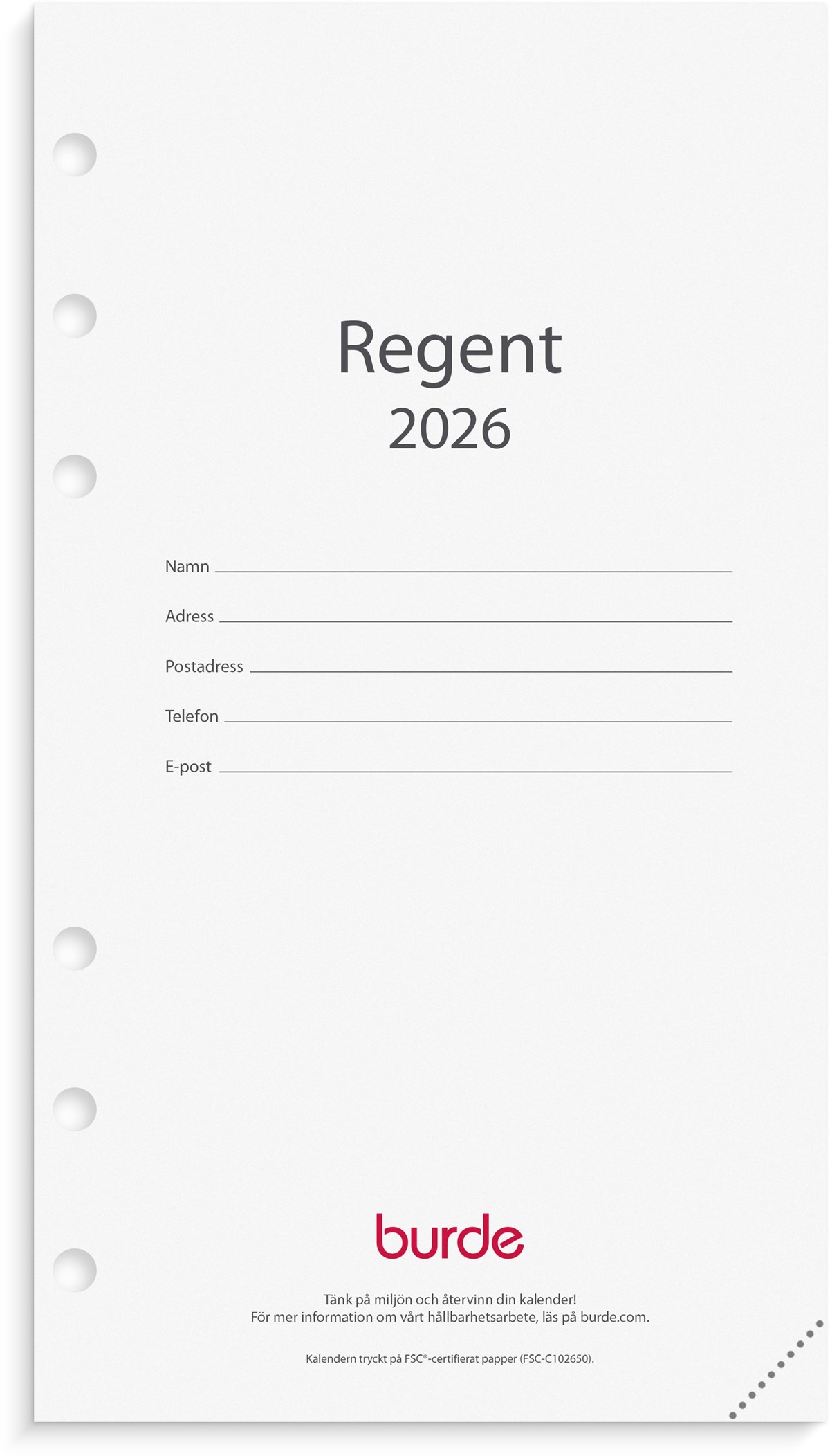 Hålad kalenderrefill till systemkalender med ringmekanism.