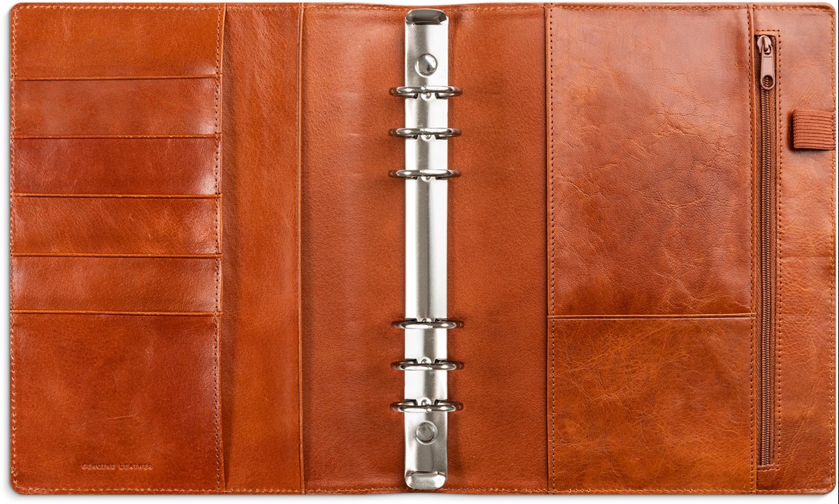 Systemkalender med grundsats. Grundsatsen innehåller hålad kalenderdel (4801) och blankettdel. Pärmen har ringmekanism (Ø 30 mm), fem kreditkortsfickor, stort myntfack med dragkedja, fack för kvitton o dyl och pennhållare. Format pärm: 185x235 mm (A5).