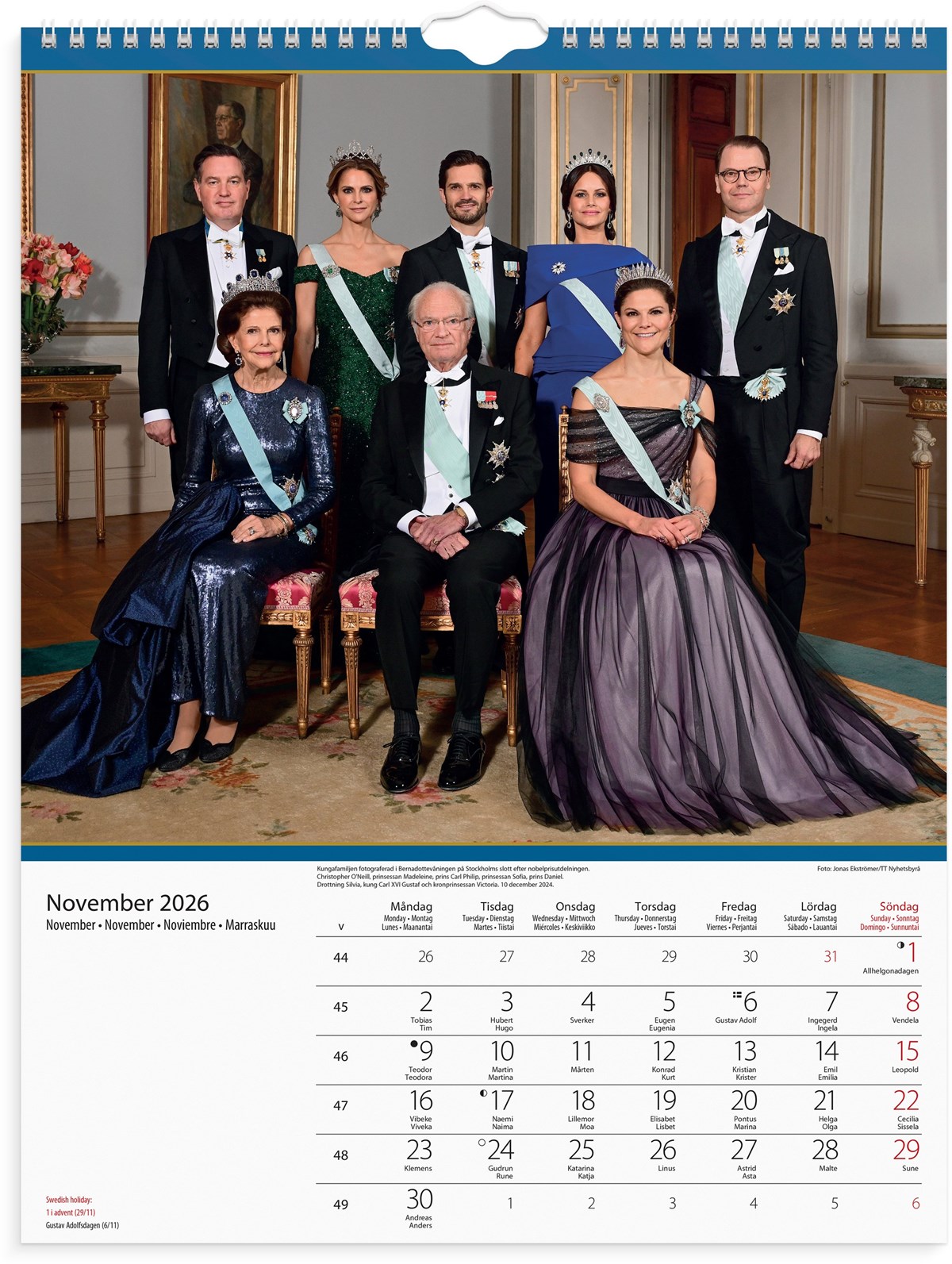 Väggkalender för överskådlig planering av vardagen. Varje sida visar en ny månad och ackompanjeras av porträtt på medlemmar från den svenska kungafamiljen. Kalendern är femspråkig (svenska, engelska, tyska, spanska och finska) men har svenska namnsdagar.