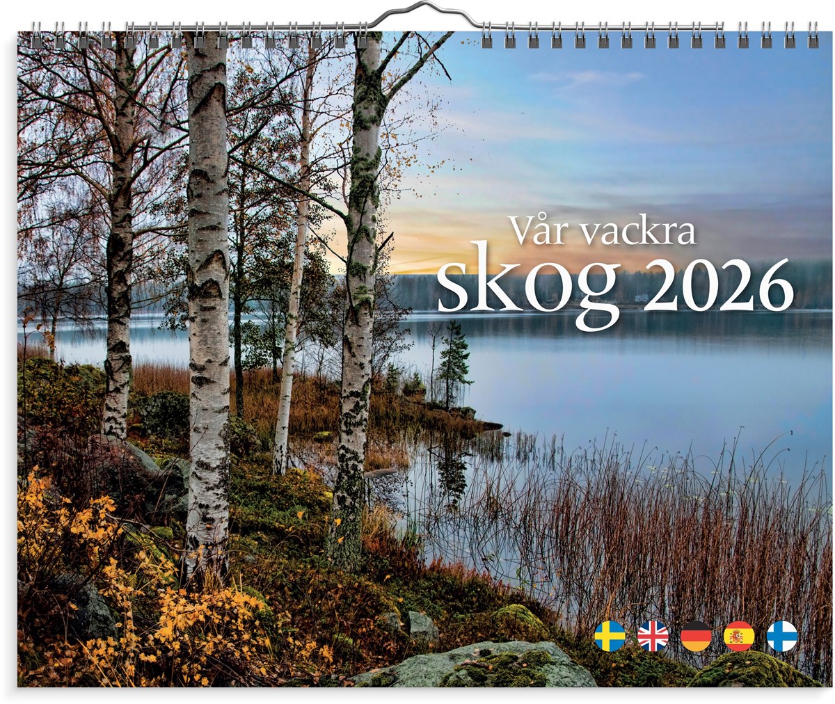 Väggkalender för överskådlig planering. Vår vackra skog visar en månad per uppslag med tolv ackompanjerande bilder av den svenska skogen och dess djurliv. Kalendern är femspråkig (svenska, engelska, tyska, spanska och finska).