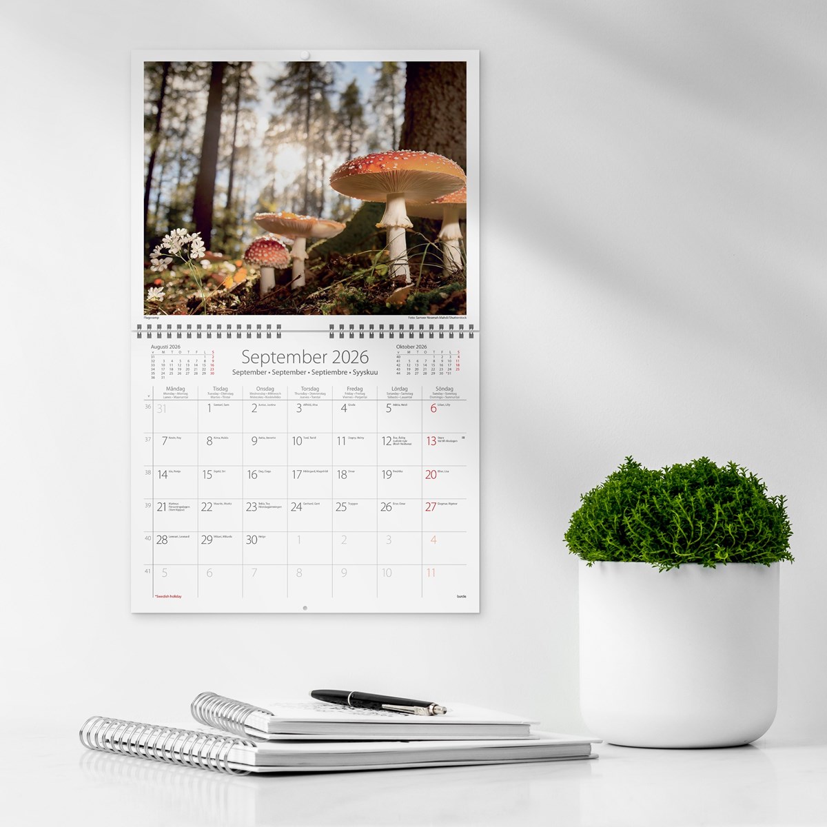 Format: 300x240 mm. Layout: Månad/blad. Kalendarium: 2026-01-01 - 2026-12-31. Omslag: Papper. Spiralbunden. Antal sidor: 12. Miljöinformation: FSC®.