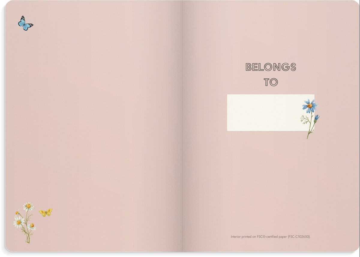 Pink Meadow omslaget i lent konstläder hålls tidsenlig genom en vacker utsmyckning av blommor och färggranna fjärilar. Med en vintage rosa bakgrund skapas ett omslag som blir både tidsenligt och personligt.