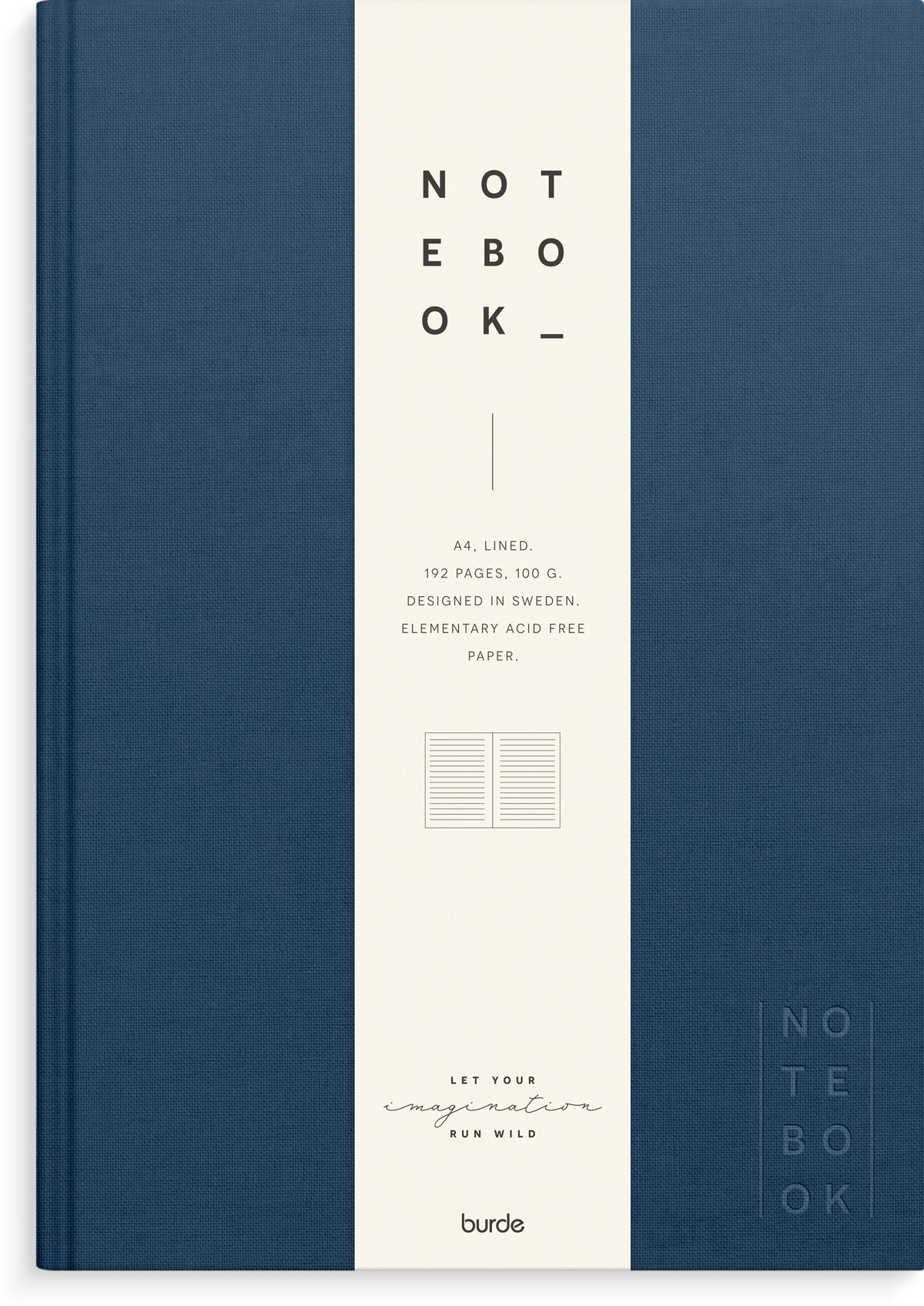 Format: A4. Layout: Linjerad. Omslag: Linnetextil. Inbunden. Detaljer: Märkband. Antal sidor: 192. Pappersvikt: 100 g. Miljöinformation: FSC-papper. Varumärke: Burde.