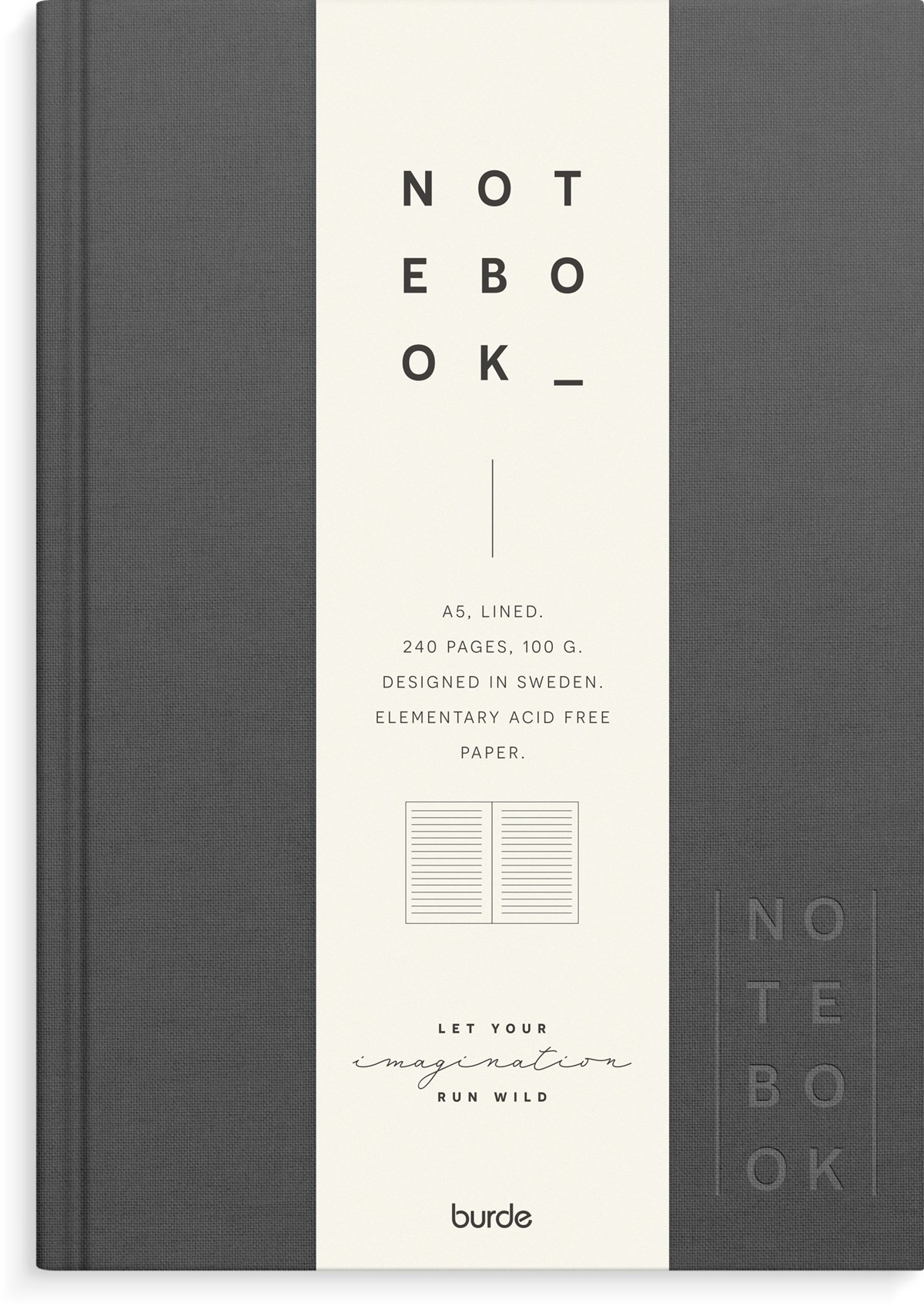 Format: A5. Layout: Linjerad. Omslag: Linnetextil. Inbunden. Detaljer: Märkband. Antal sidor: 240. Pappersvikt: 100 g. Miljöinformation: FSC- papper. Varumärke: Burde.