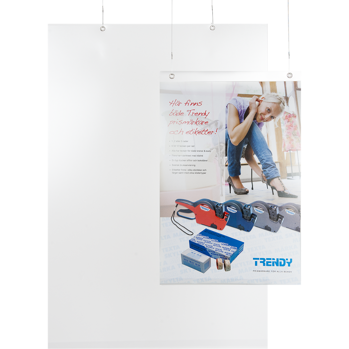 Frihängande plastficka för affischer. Nederkant av fickan har ett uppvik som håller affischen på plats. Plastfickan är tillverkad i antireflesplast och har öljetter i överkant.
