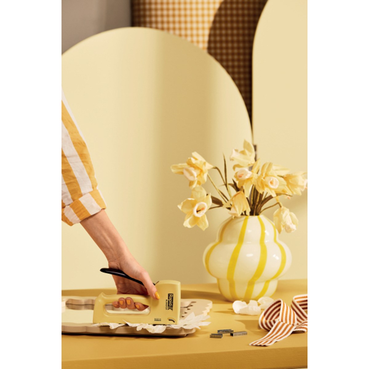 Upptäck vår fantastiska häftpistol R13 - det ultimata verktyget för att släppa loss kreativiteten. Tillverkad av 90% återvunnen plast, hämtad från gamla kylskåp, är detta verktyg både ett praktiskt och hållbart val. Att häftpistolen är producerad i vår hemstad Hestra är något vi är stolta över. Att ha produktion i Sverige ger inte bara högkvalitativa produkter utan bidrar också till en känsla av lokal stolthet och ansvar. Under våren och sommaren blomstrar Sverige, våra fält och ängar täcks av blommor och det är därfrån vi fann inspirationen till den vackra gula färgen. I linje med de senaste trenderna inom heminredning blir denna häftapparat ett elegant och funktionellt tillägg till din verktygslåda.
