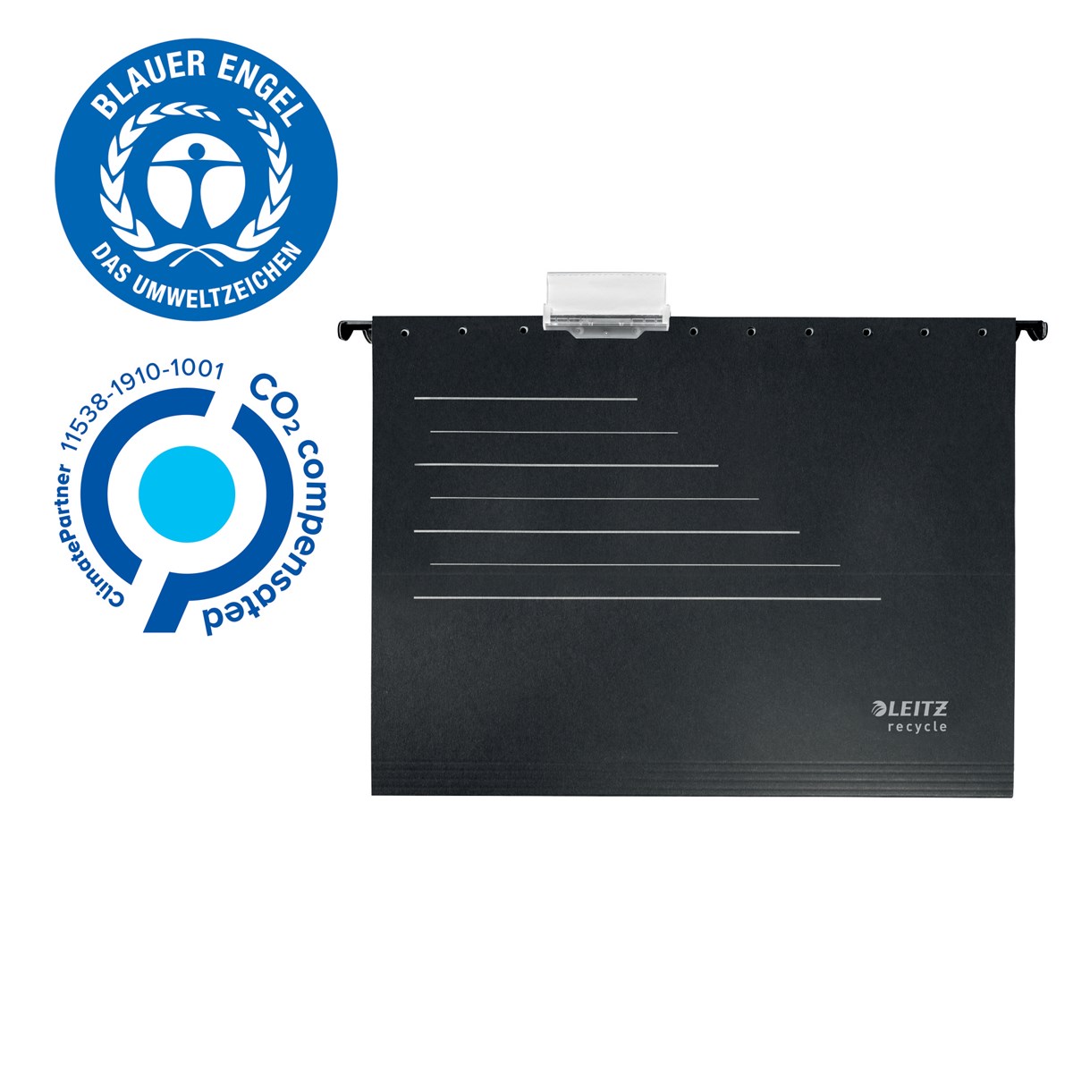 Stilren, högkvalitativ hängmapp med v-botten som passar för A4. 100% återvunnen kartong, klimatneutral genom CO2-reduktion och kompensation, 100% återvinningsbar och med miljöcertifiering från Blue Angel. Maximera förvaringsutrymmet med vertikal arkivering för att hålla papper tillgängliga och organiserade. De starka och hållbara skenor klarar tung användning och den medföljande etiketthållaren hjälper till att organisera och identifiera innehållet. Den här robusta hängmappen är gjord för att hålla länge och kompletterar andra produkter från Leitz Recycle-sortimentet. Miljövänliga och moderna kontorsprodukter som passar bra hemma och på kontoret. Med det miljövänliga Recycle-sortimentet från Leitz kan du både förbättra din kontorsmiljö - och miljön på vår planet.