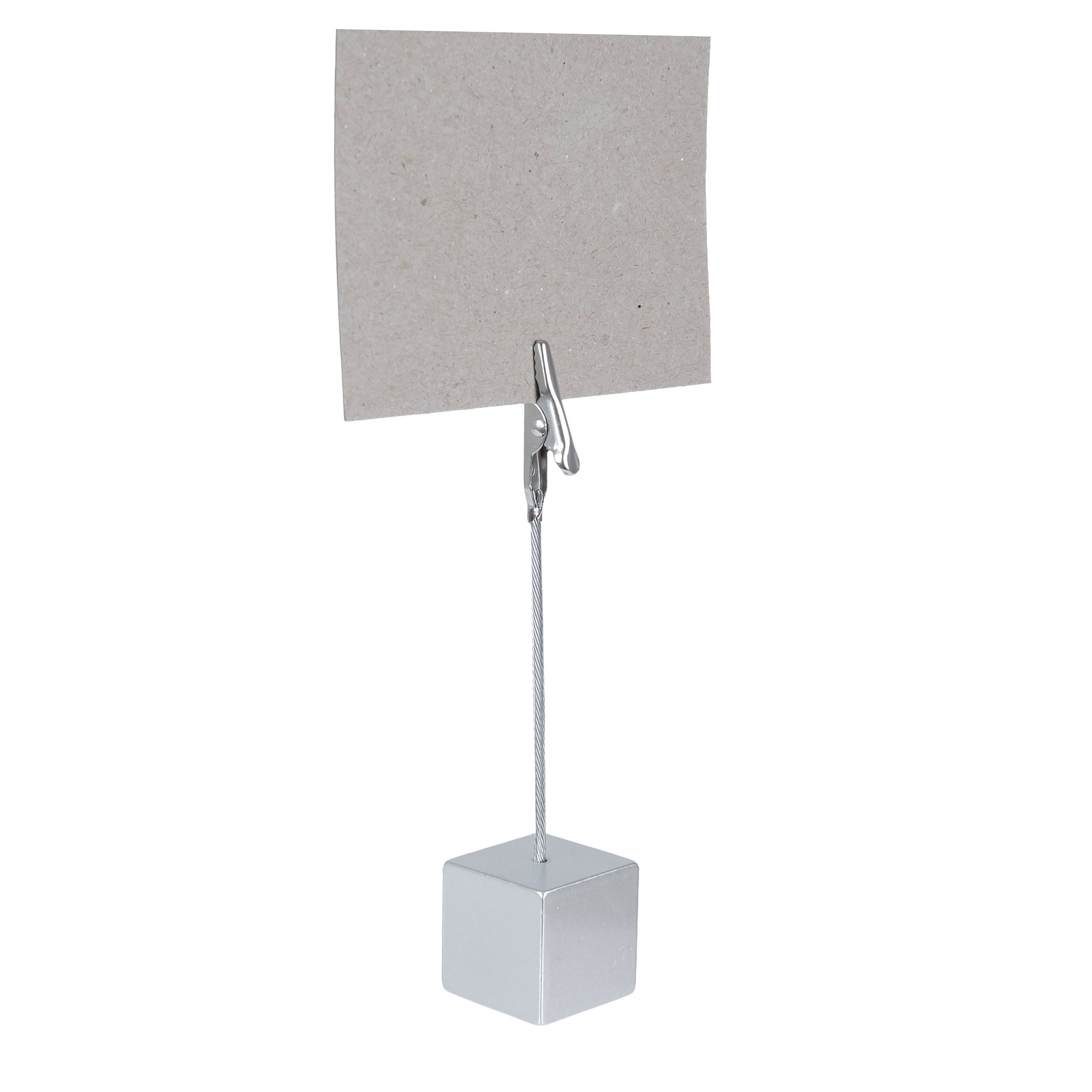 Krokodilklämma på stång med fot. Höjd: 11,5 cm. Fot: 2,5 x 2,5 cm.